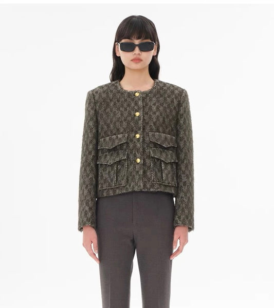 Concise-White Tweed Gold Buckle Pocket Short Jacket Green