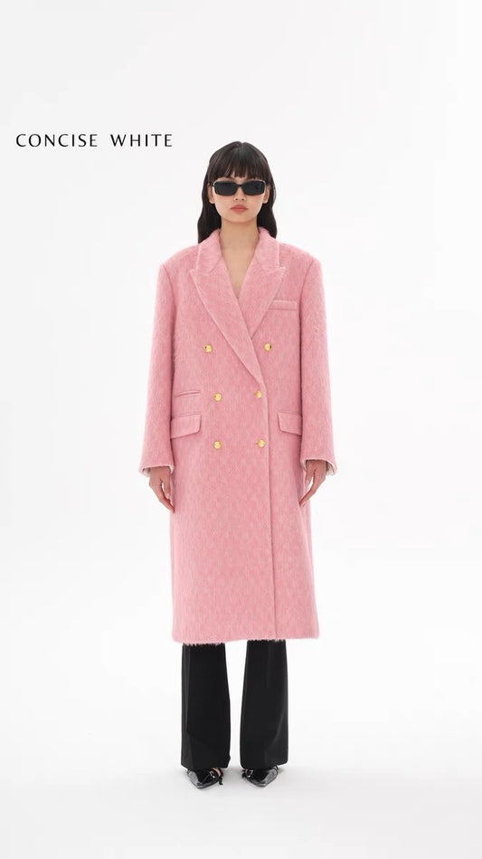 Concise-White Double-Breasted Gold Buckle Long Coat Pink