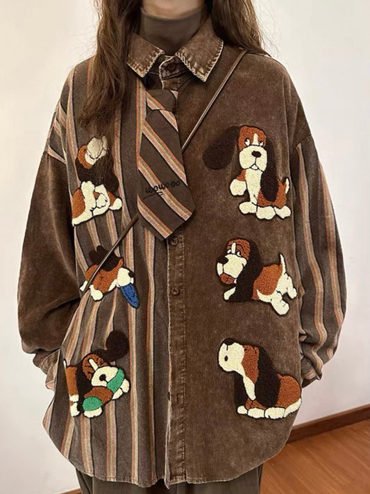 ✦FX✦ Retro Dog Print Embroidery Corduroy Tie Shirt
