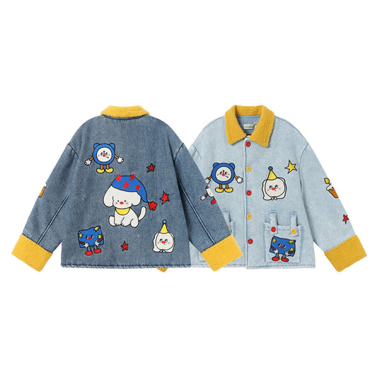 ✦FX✦ Fun Cartoon Embroidered Lamb Plush Denim Jacket