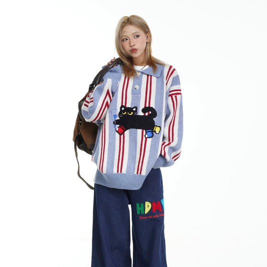 ✦FX✦ Retro Cute Kitten Lapel Knit Stripped Sweater