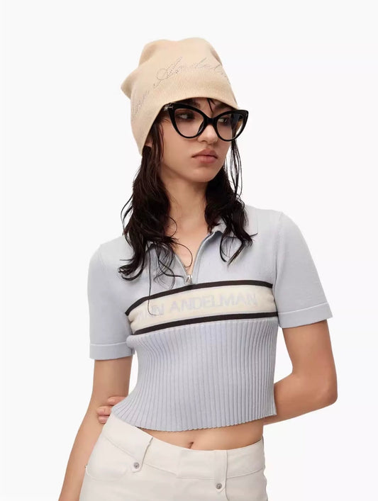 13DE MARZO Plaid Cuff Knit Polo Top Gray