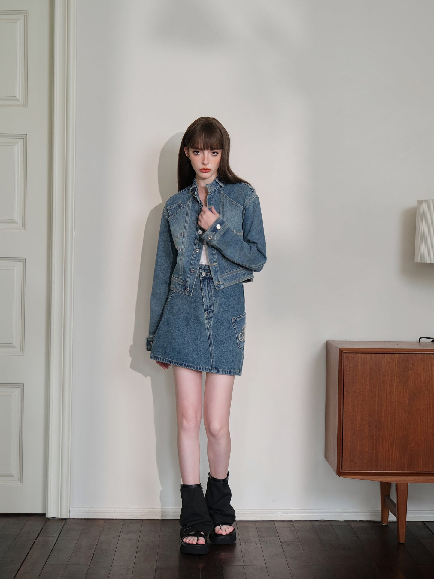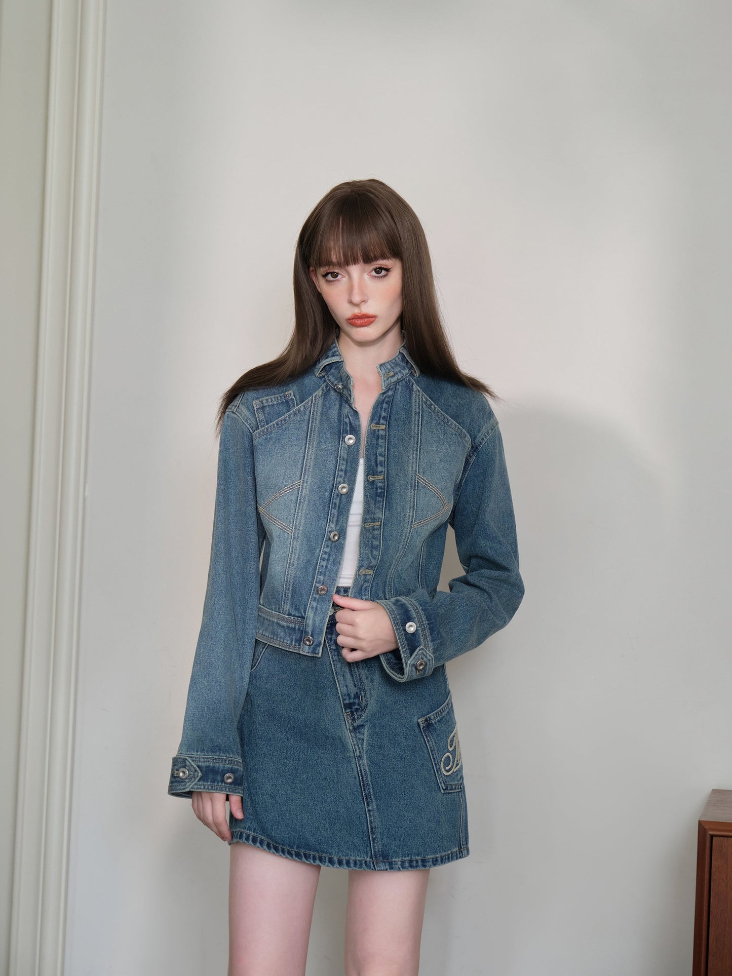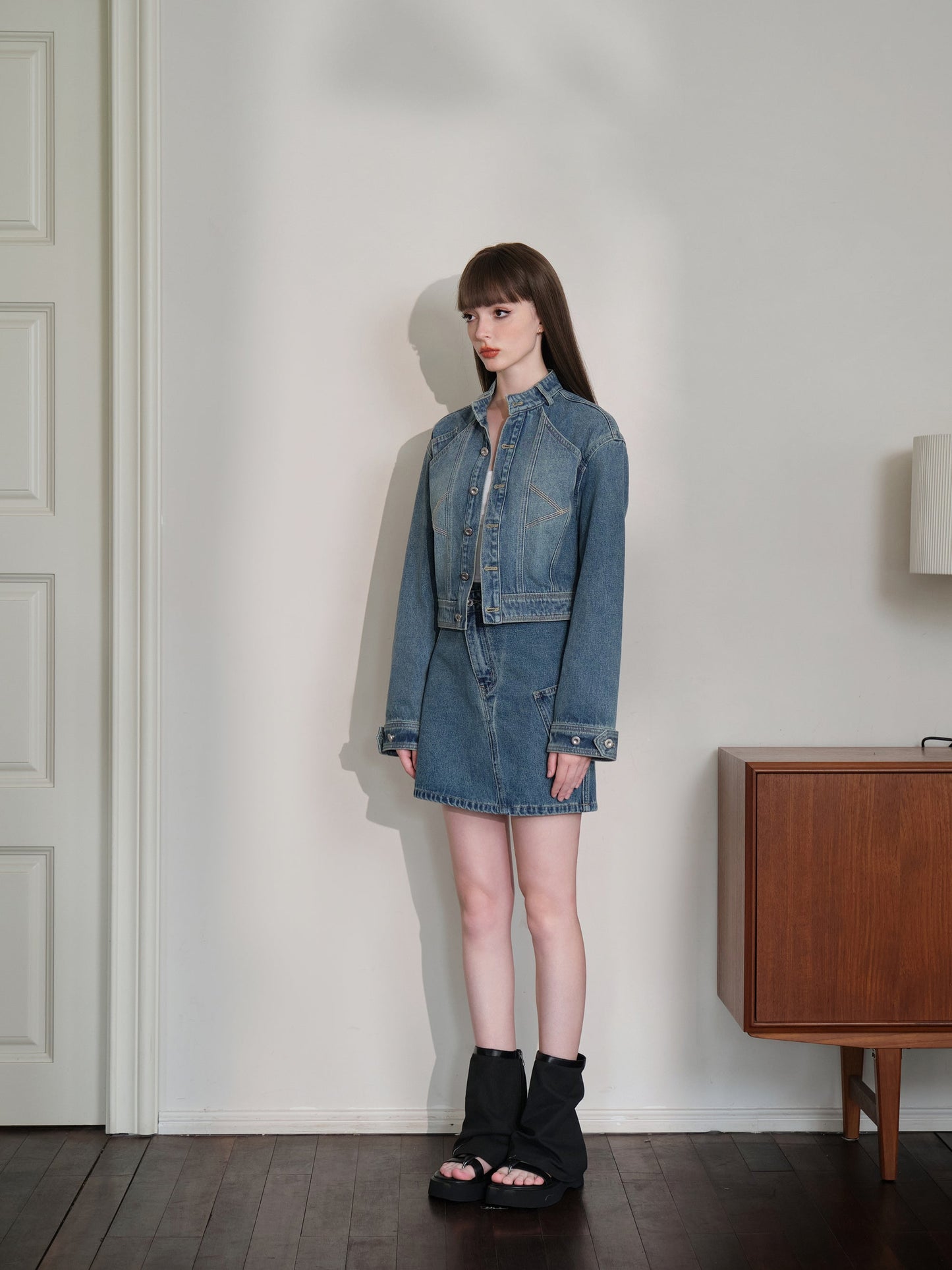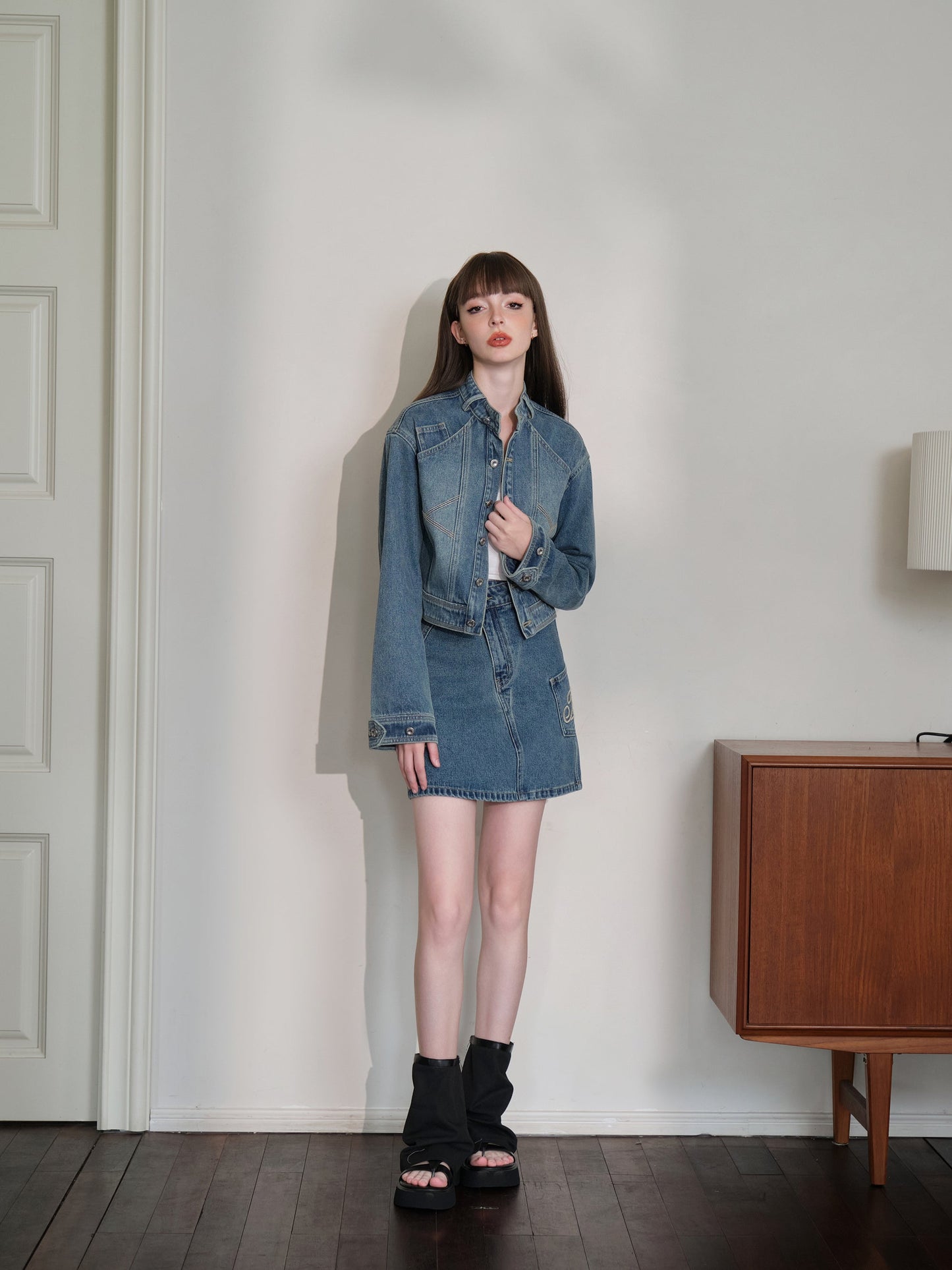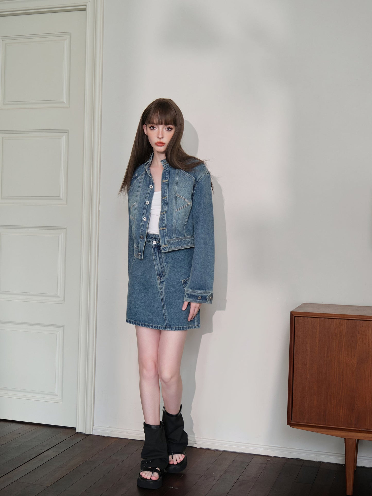 THREE QUARTERS Vintage Washed Denim Jacket and Skirt