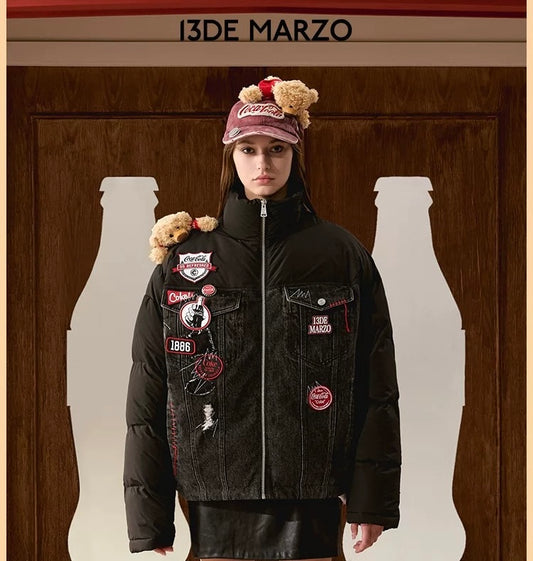 13DE MARZO x Coca-Cola Bear Denim Patch Down Jacket Black