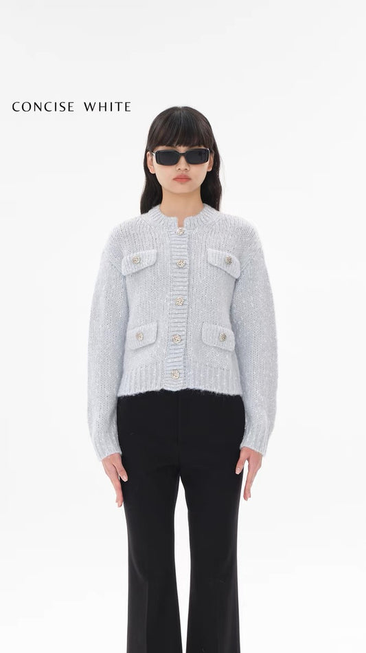 Concise-White Tweed Knitted Cardigan Baby Blue