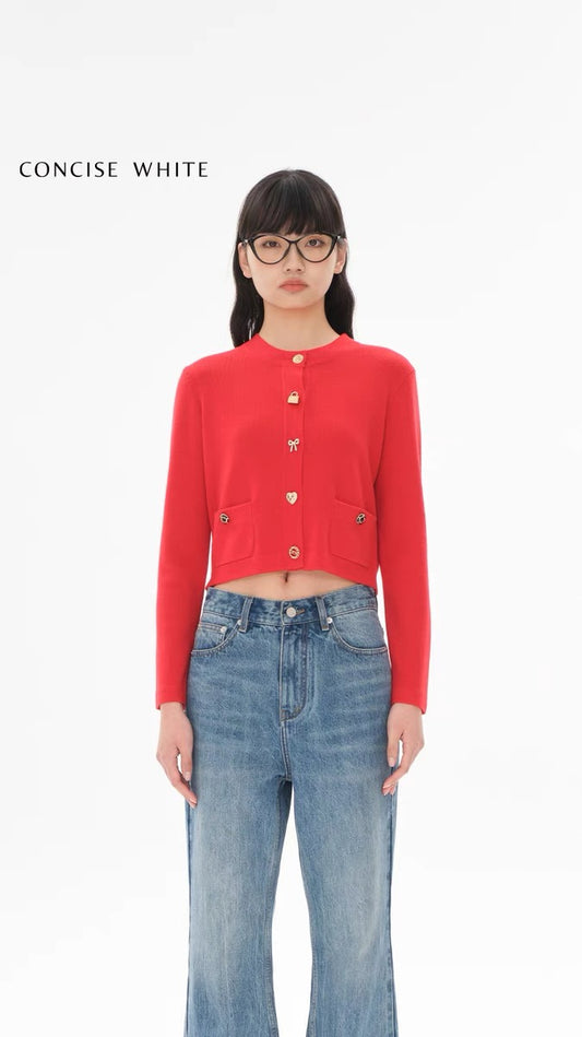Concise-White Toy Button Short Cardigan Red