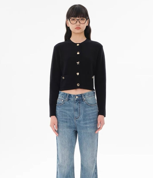 Concise-White Toy Button Short Cardigan Black