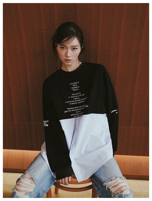 Concise-White Stitching Fake Two-Piece Letter Long Sleeve T-Shirt