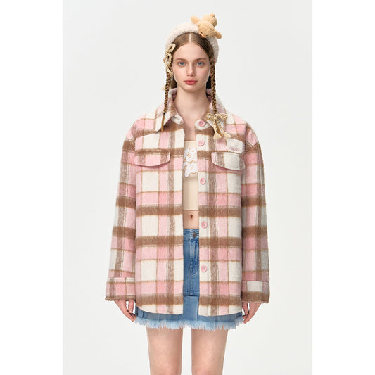 13DE MARZO Bear Tweed Plaid Shirt Pink