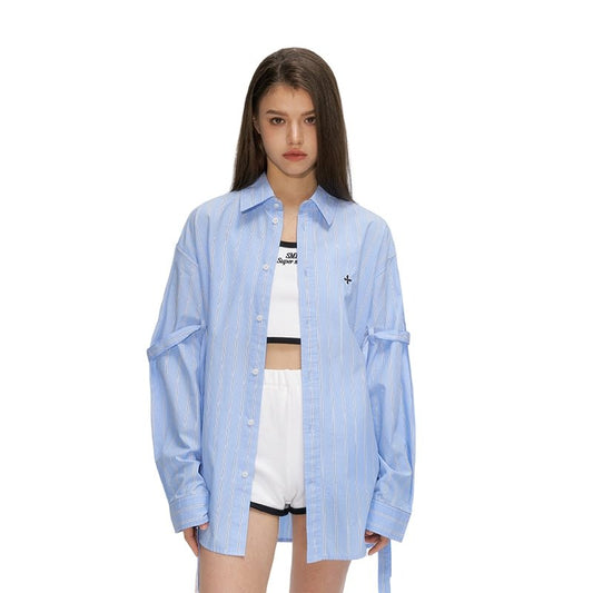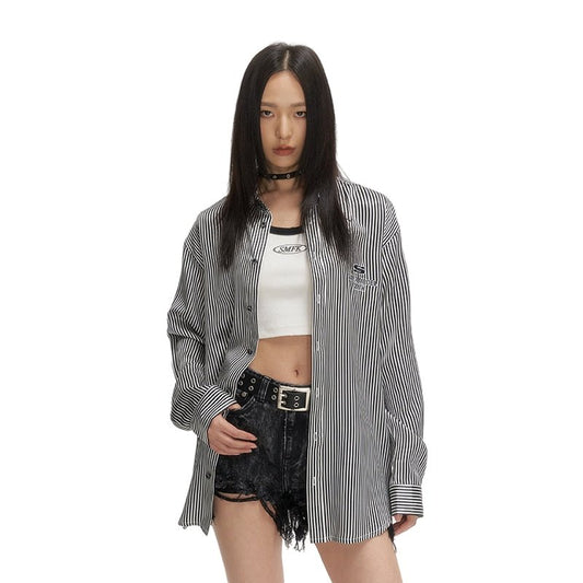 Concise-White Striped Embroidered Pocket Long Sleeve Shirt