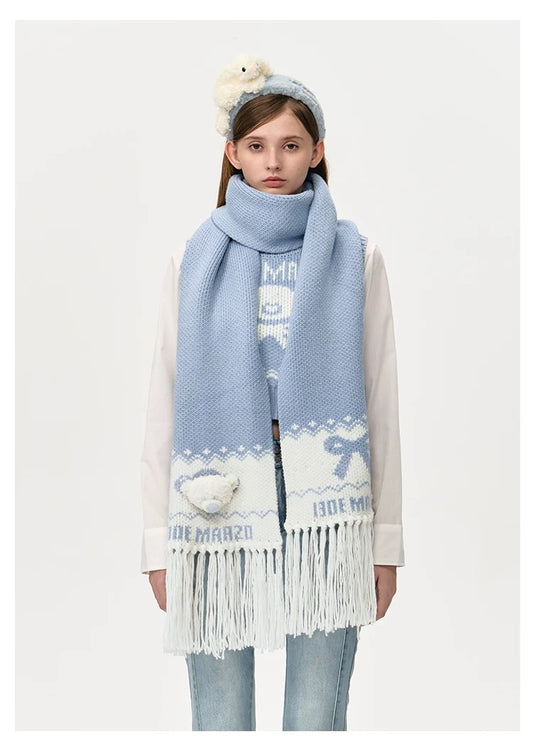 13DE MARZO Fair Isle Bear Knit Scarf Blue