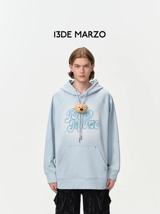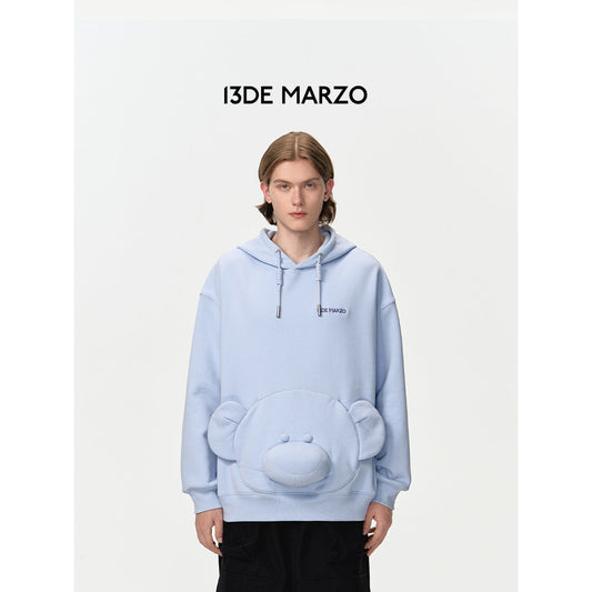 13DE MARZO Bear Embossment Pocket Hoodie Blue