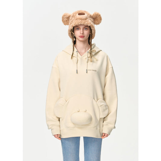 13DE MARZO Bear Embossment Pocket Hoodie Beige