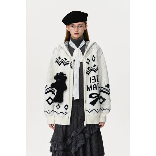 13DE MARZO Fair Isle Bear Zip Knit Hoodie White