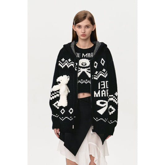 13DE MARZO Fair Isle Bear Zip Knit Hoodie Black