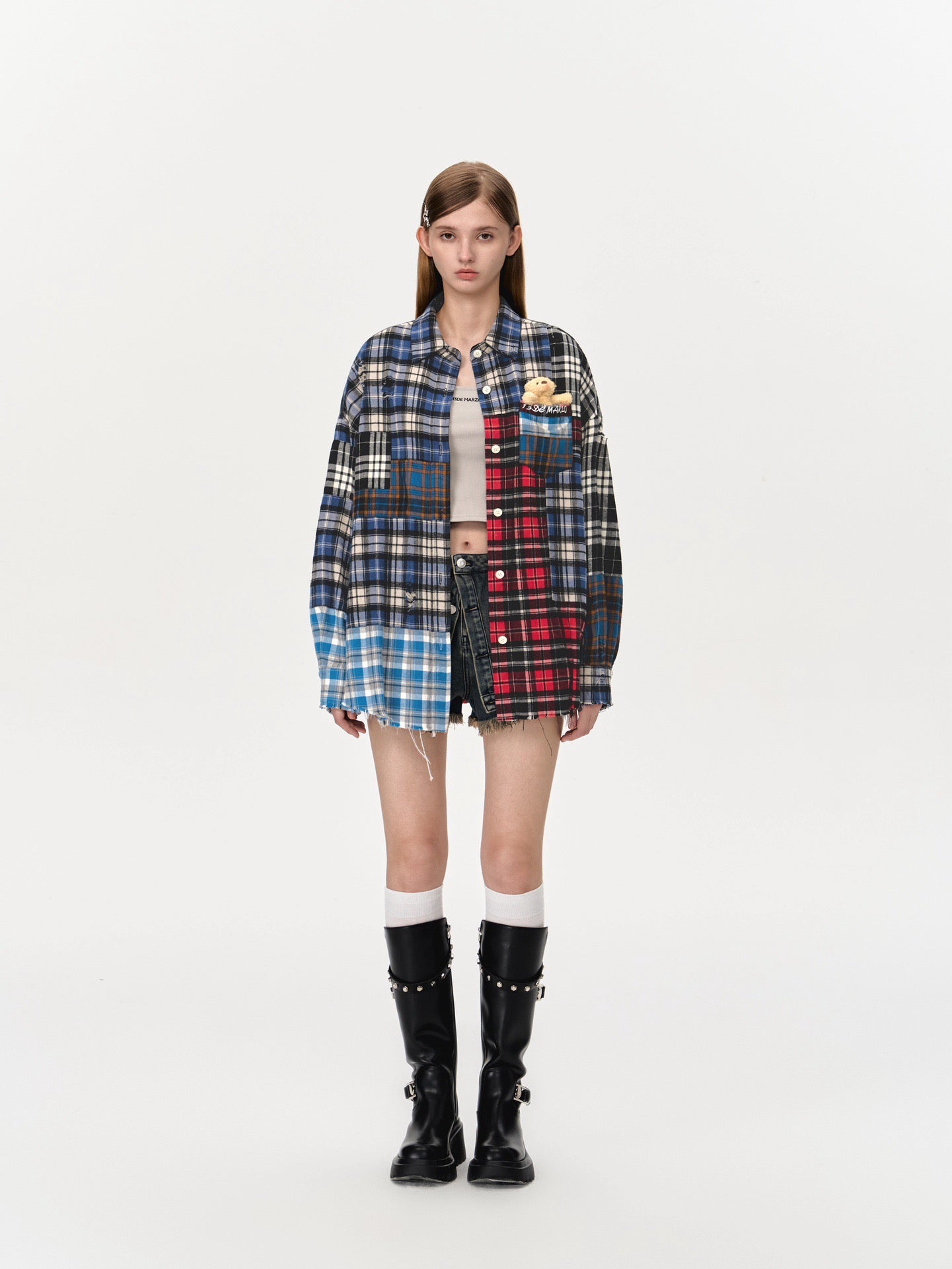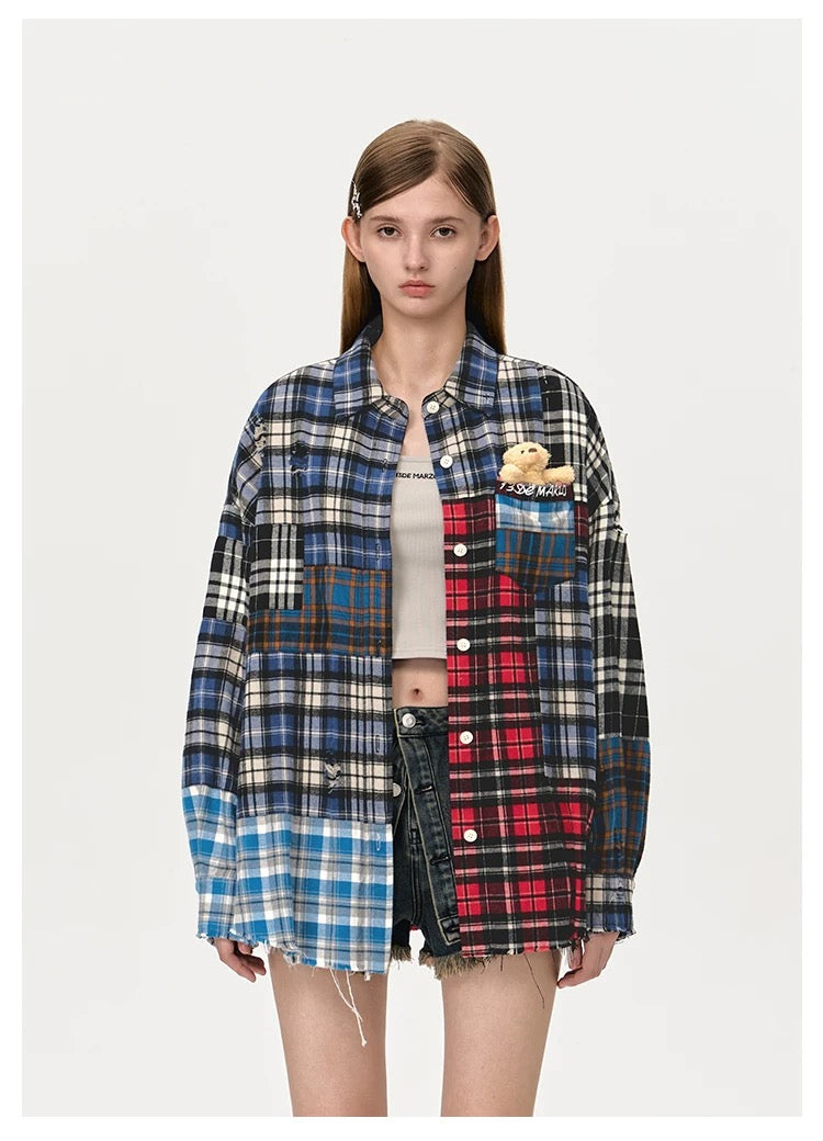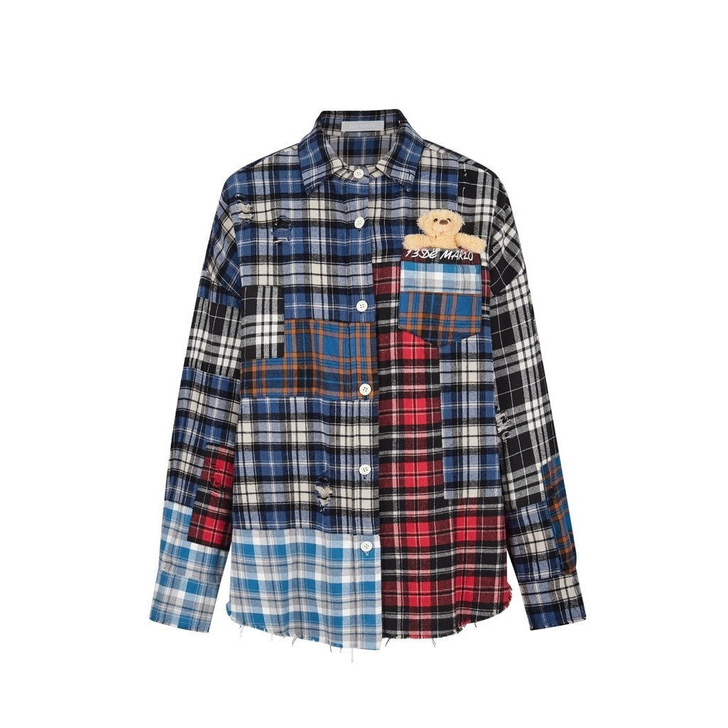 13DE MARZO Bear Broken Plaid Patch Shirt Color Patch