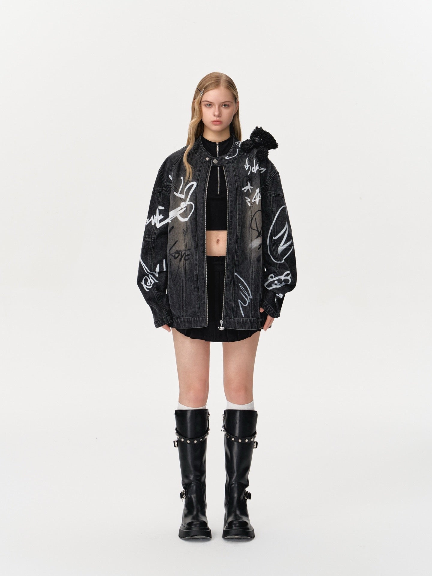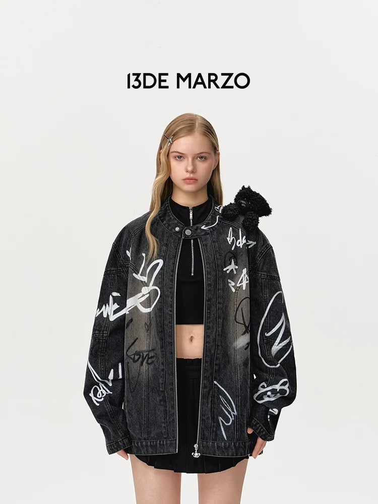13DE MARZO Graffiti Bear Racing Denim Jacket Black