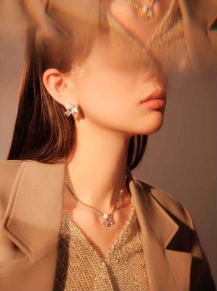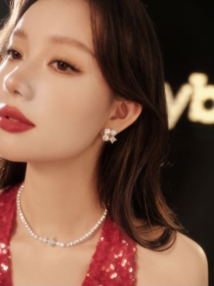 - Materials: Rhodium-plated copper, synthetic cubic zirconia, sterling silver, shell pearl