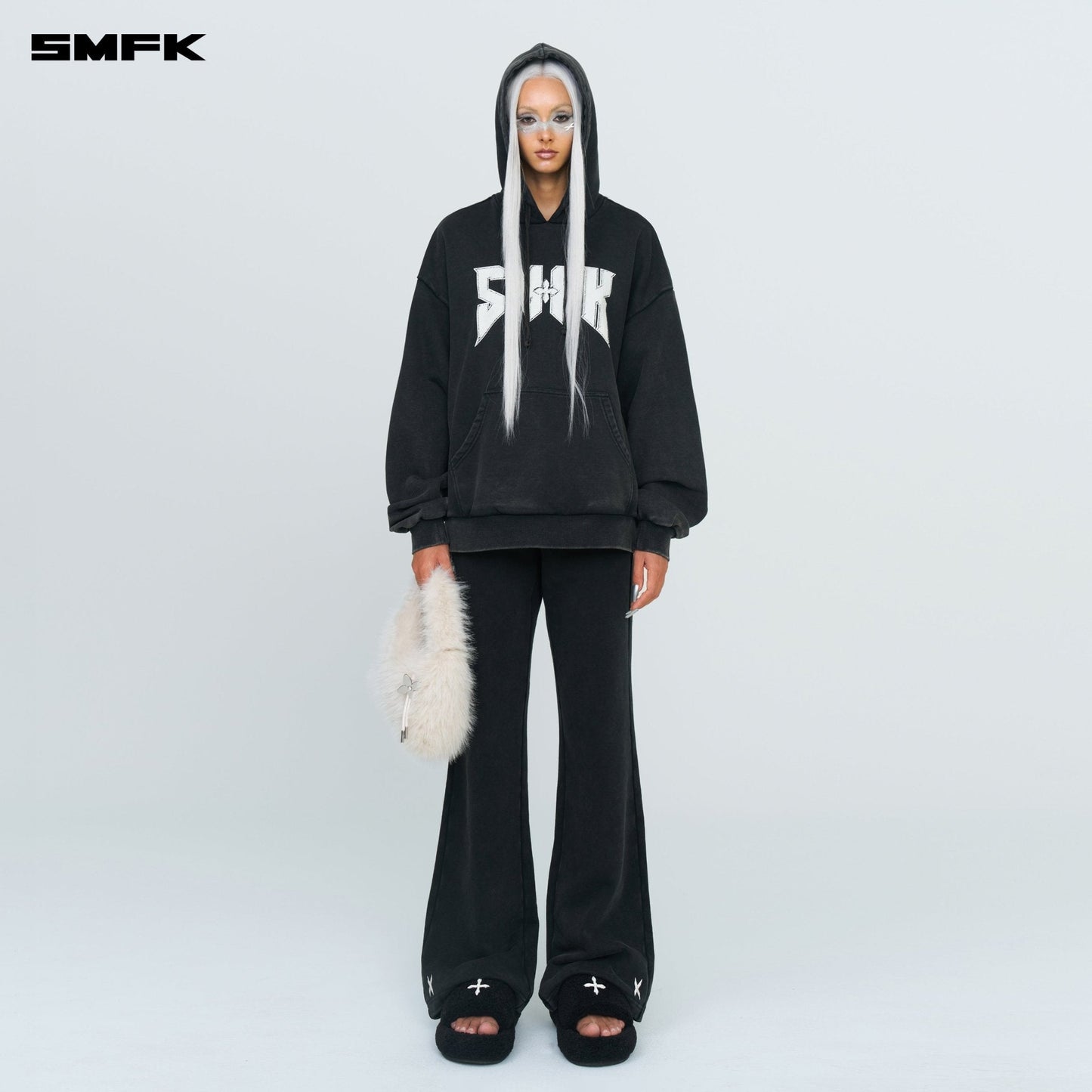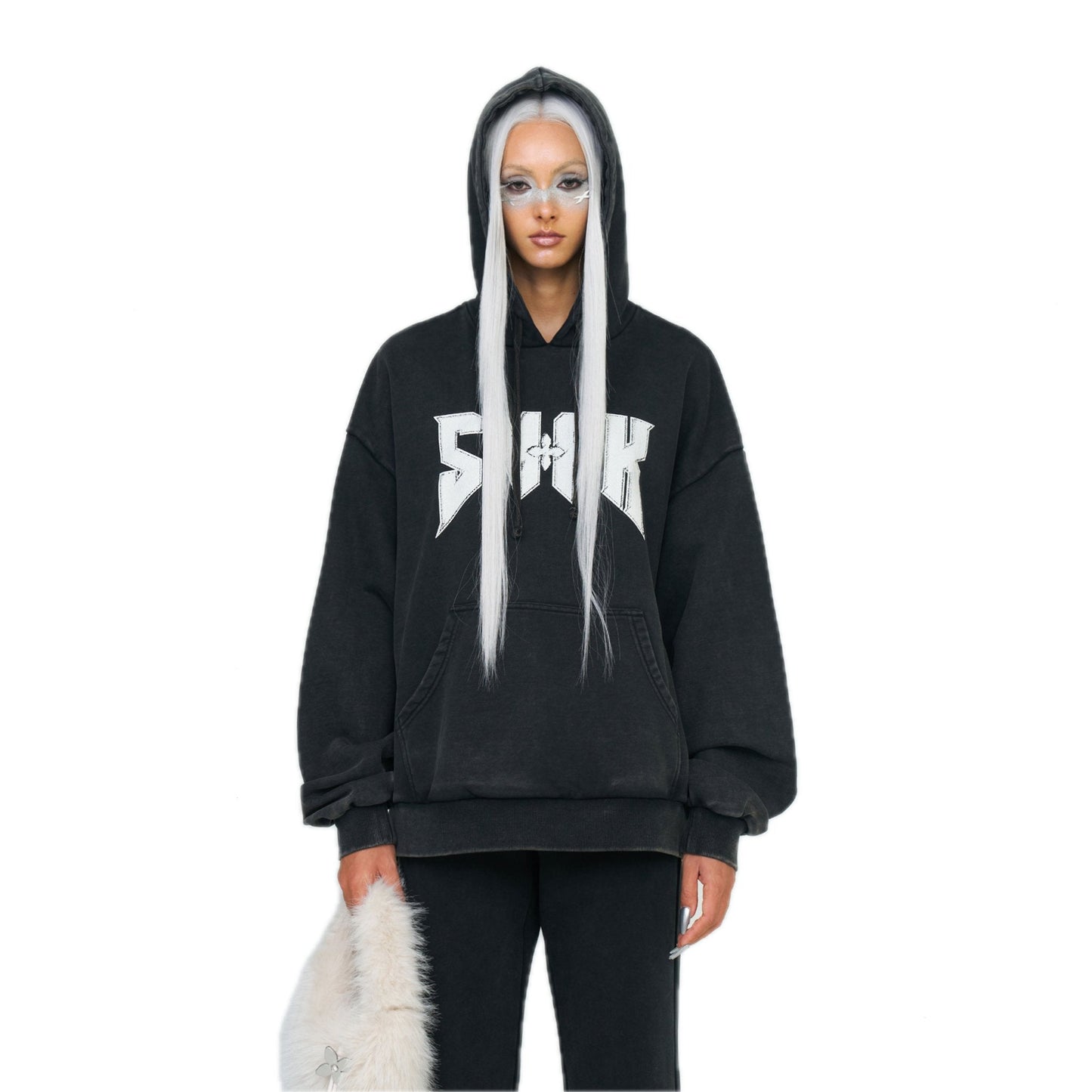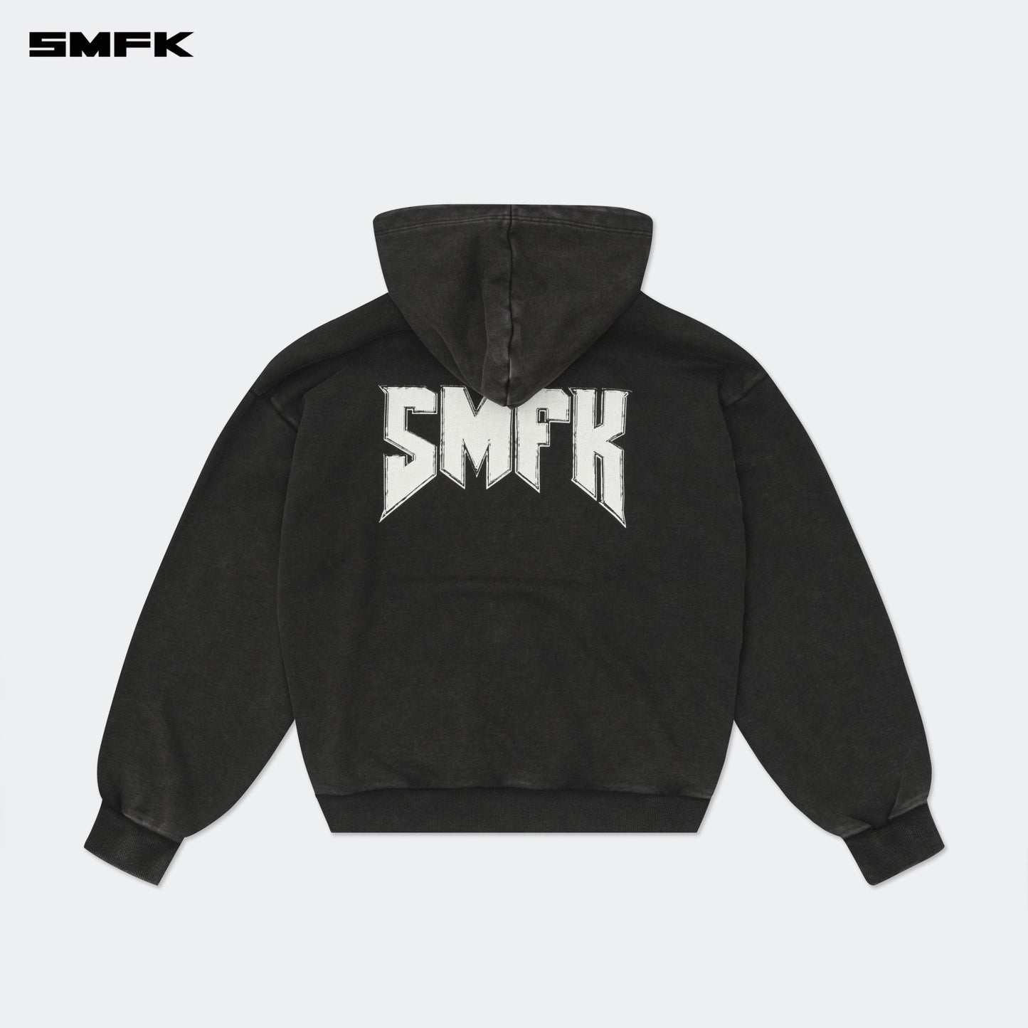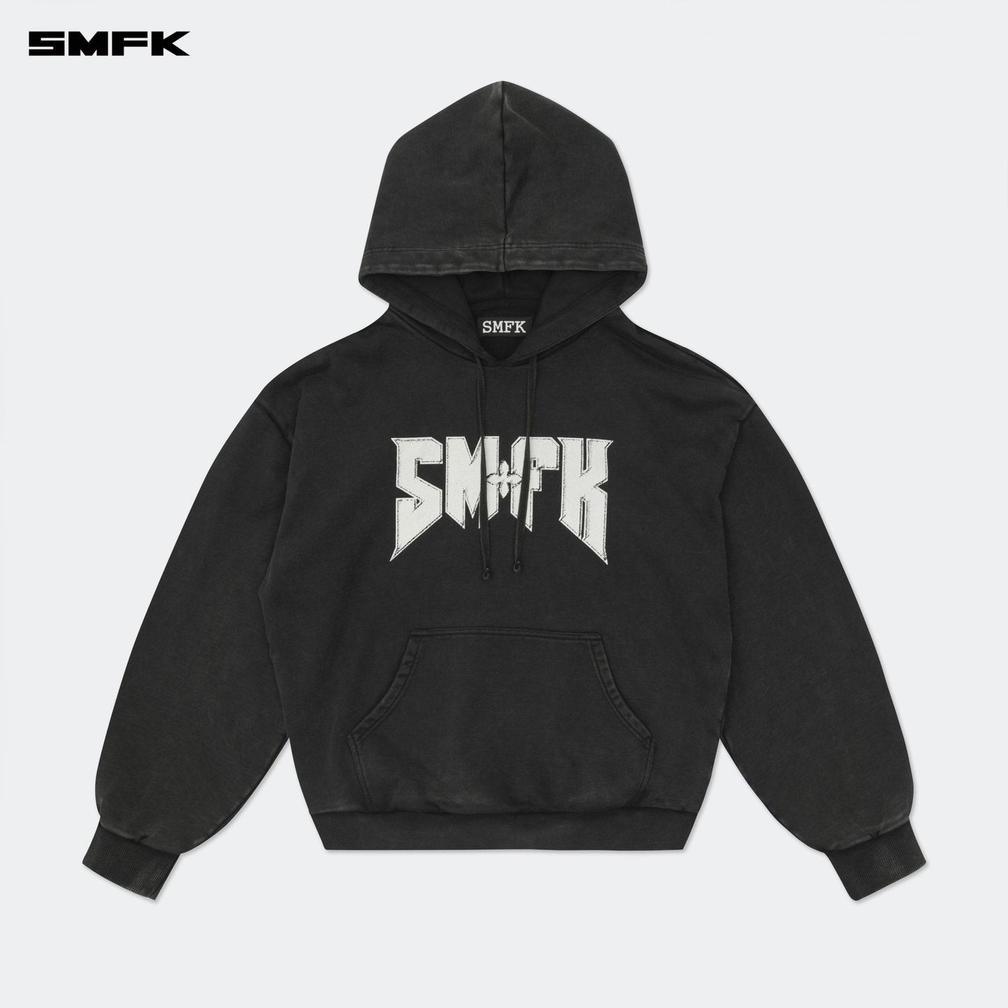 - Design: SMFK classic oversized sports hoodie with metallic rock band style font graphic printed on the front and back. The gray fabric is washed and then