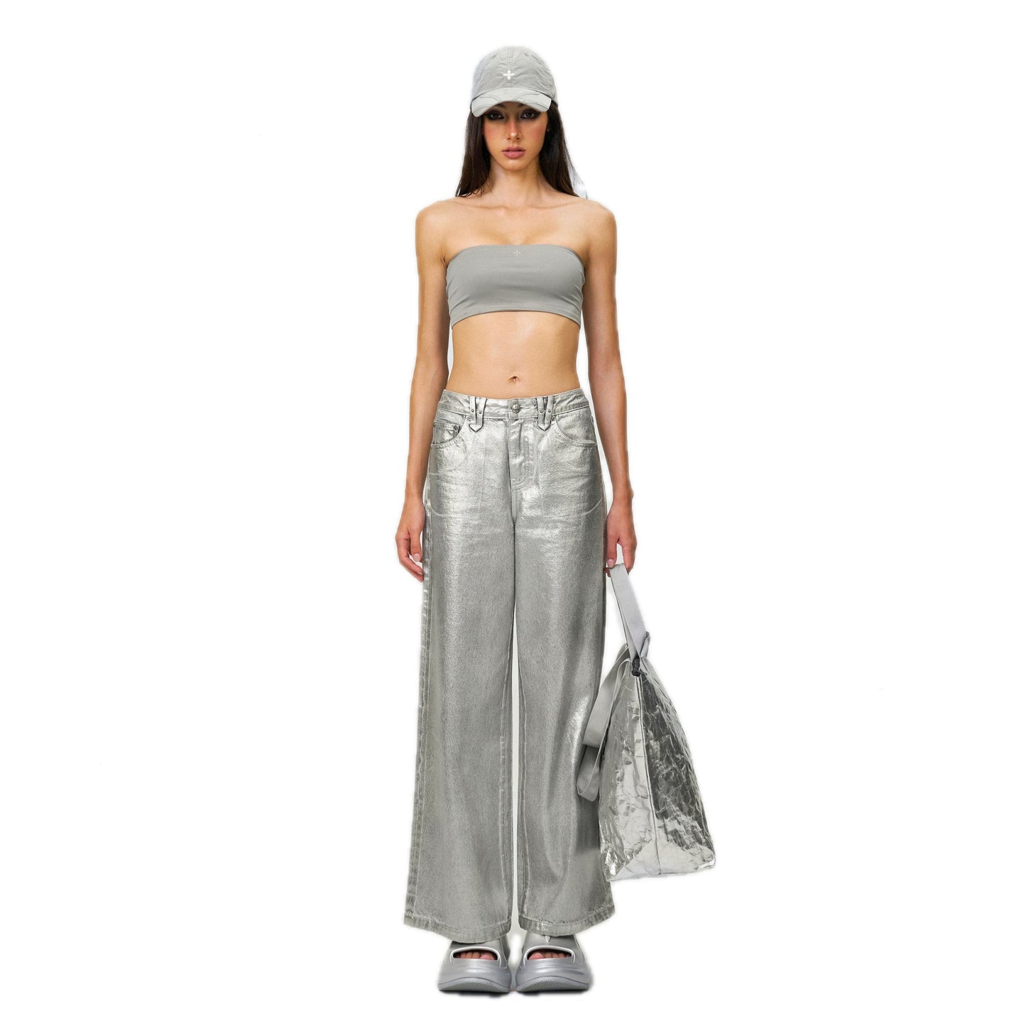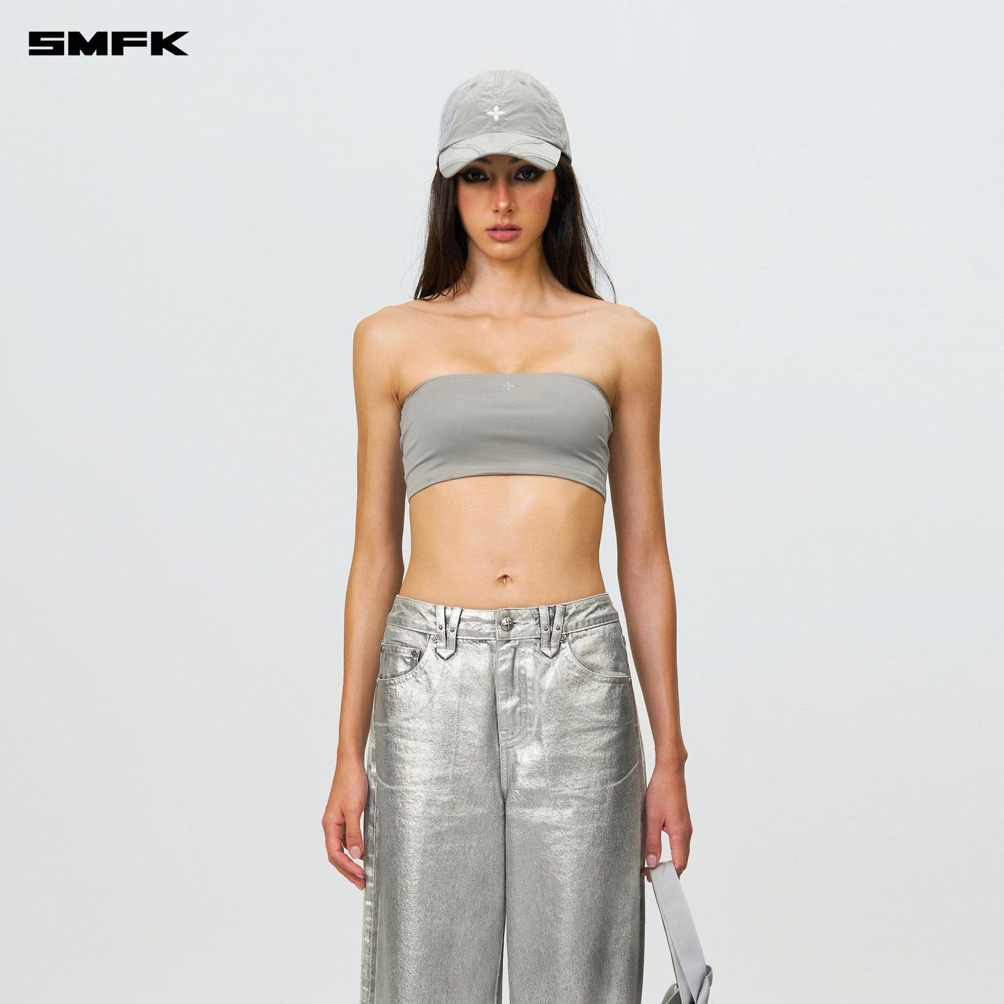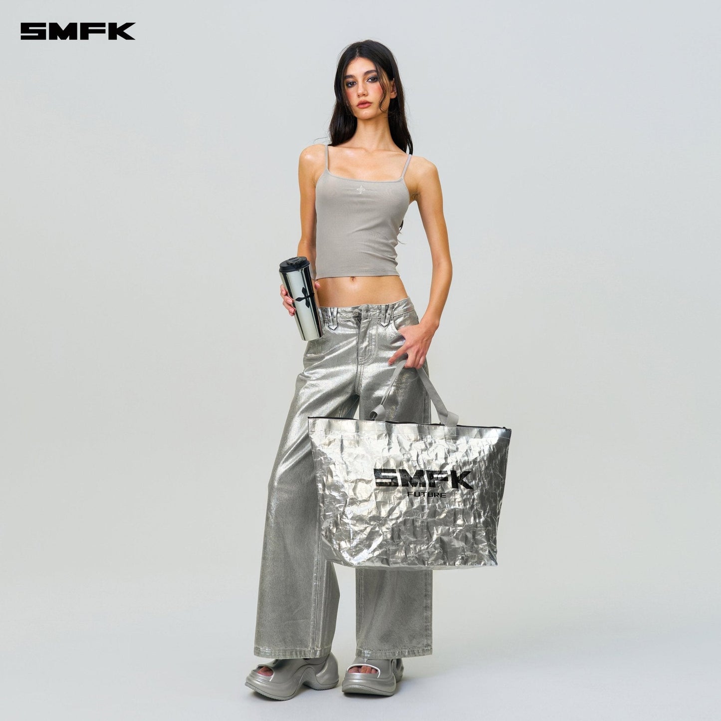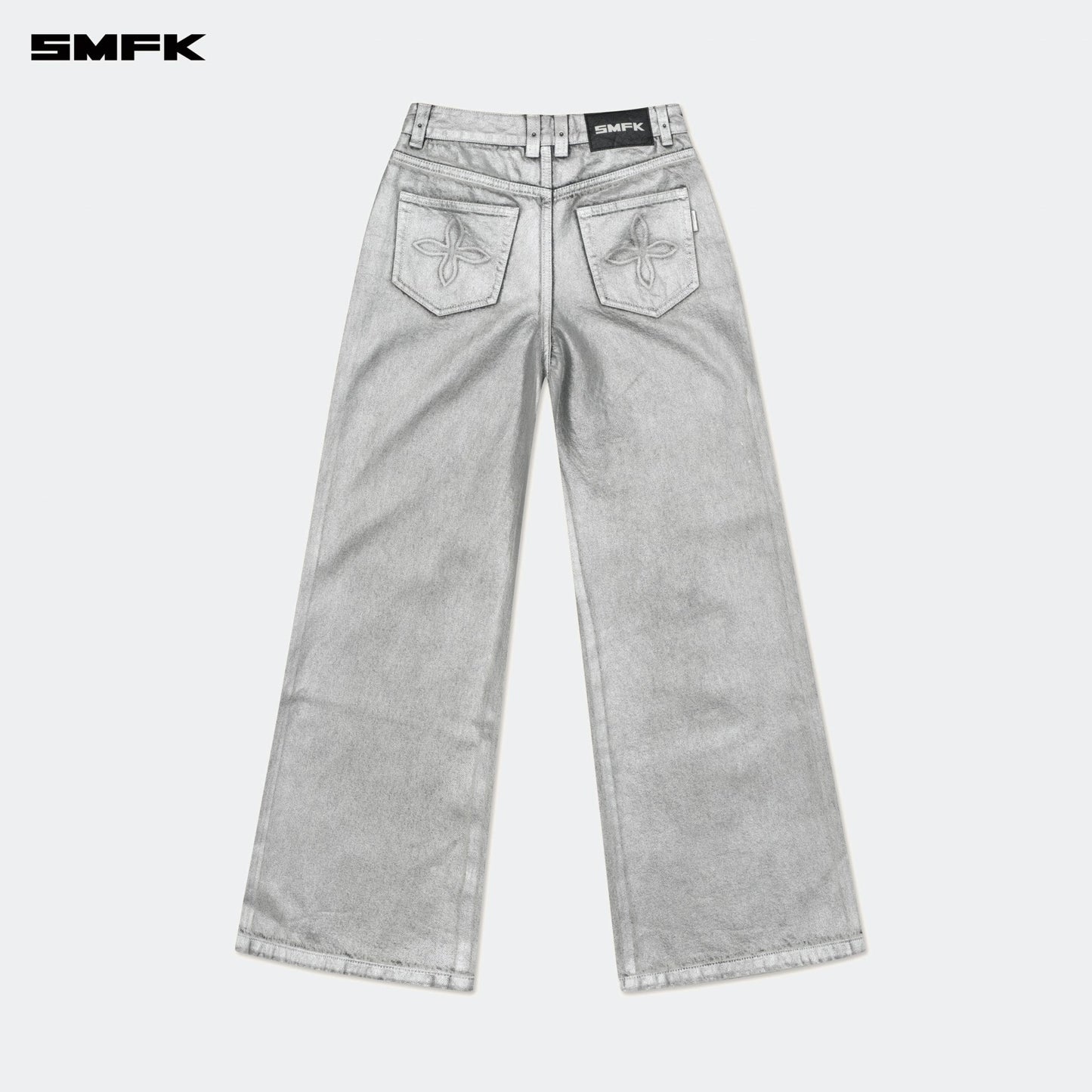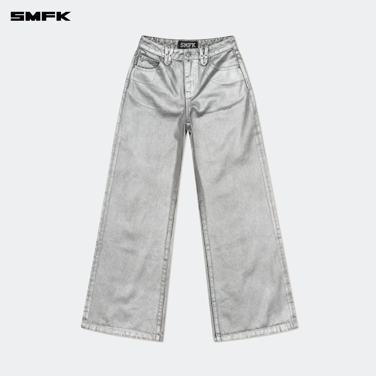 - Design: The UJ004SL model is a classic wide-leg denim pant from SMFK's 2024 collection. It features a hand-applied silver paint process combined with a washed-out finish, achieving a new retro denim fabric texture with a metallic polished luster. The iconic SMFK V-shaped belt loops enhance the design.