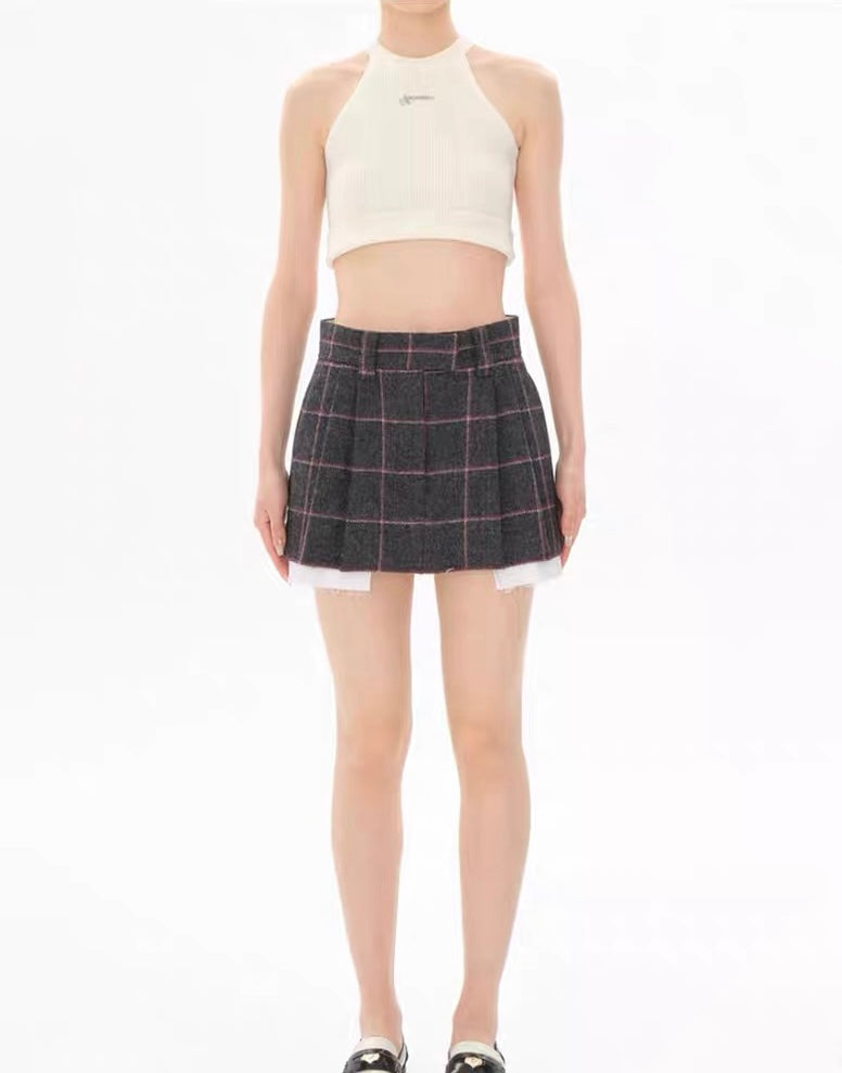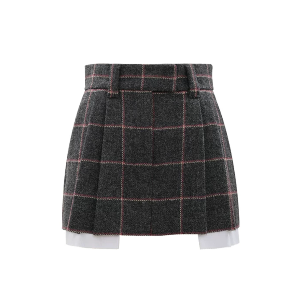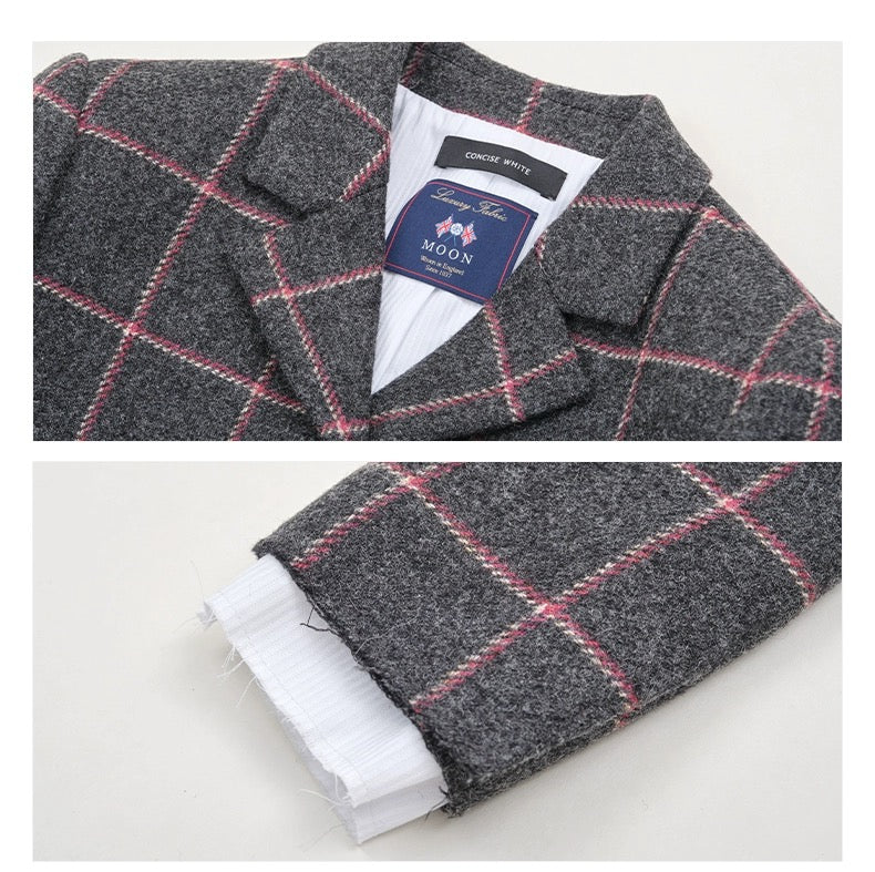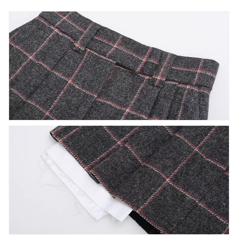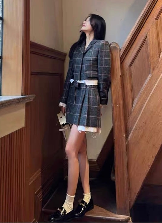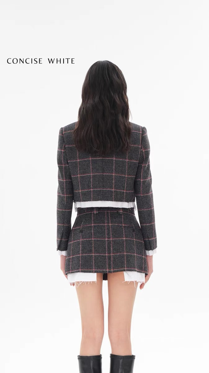 Concise-White Plaid Wool Short Coat and Skirt Set White Edge