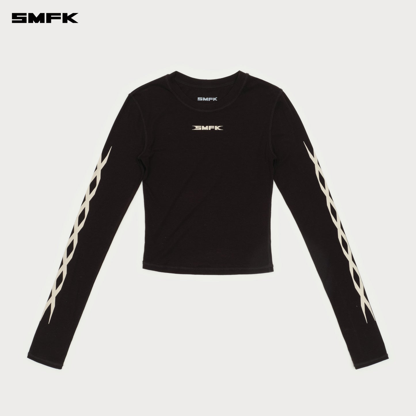 - Design: SMFK classic sports top, the design is inspired by dance training clothing, emphasizing the lengthening of the arms. The inner side of the sleeves increases the arm movement, which can cope with more dance movements such as raising the hands. The slightly waisted version is more targeted at daily scenes. The SMFK ripple font is printed on the neckline, and the X gene chain pattern is printed on the arm.