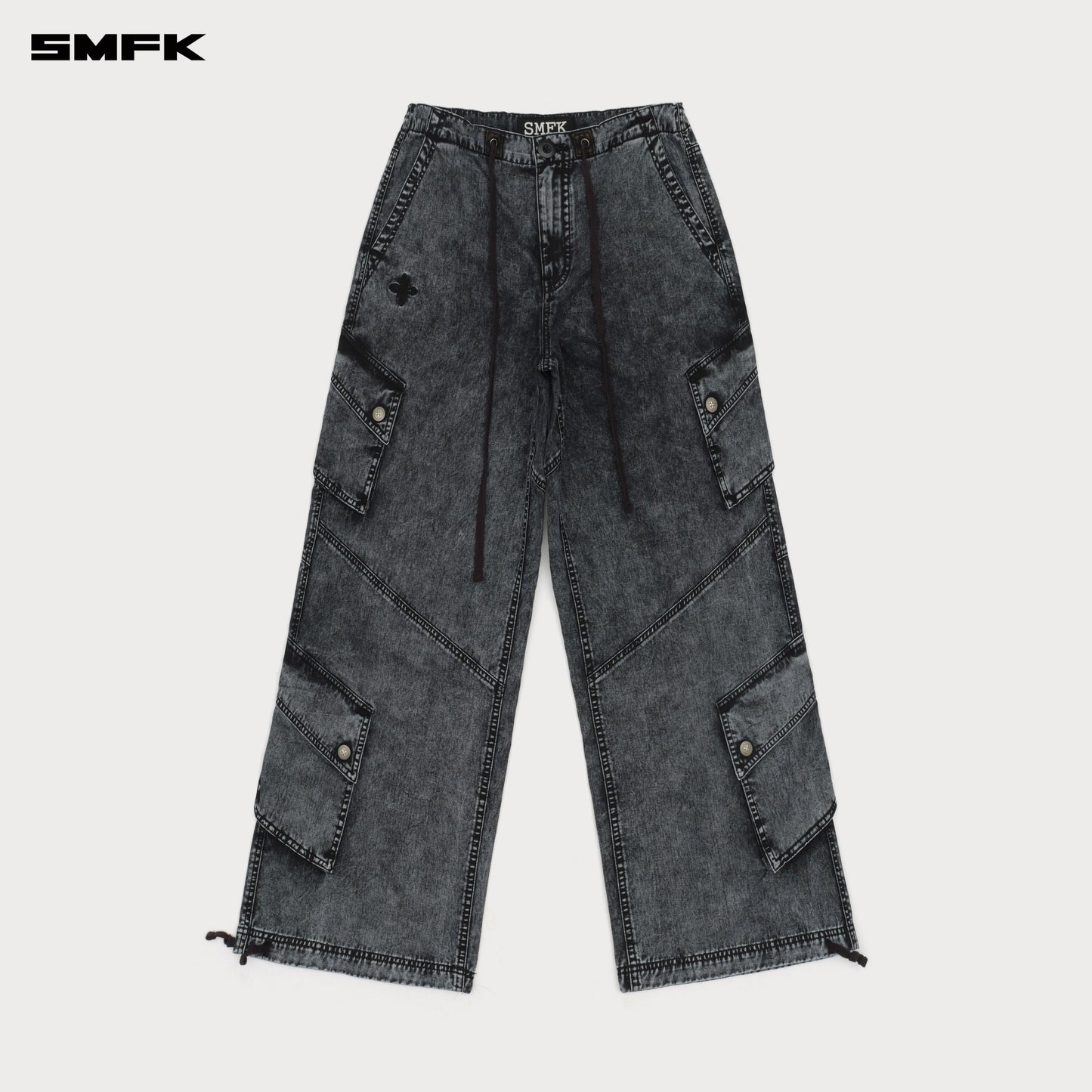- Design: SMFK ICON classic paratrooper pants, mid-waist version, straight wide waist version, cotton work drawstring at the waist, can adapt to a variety of body shapes and wearing styles, special-shaped four pockets configuration, three-dimensional work pockets, pocket covers are equipped with circular cross metal snaps, the front and back at the knees use oblique stitching to stabilize the fabric structure and avoid deformation at the knees after long-term wear.