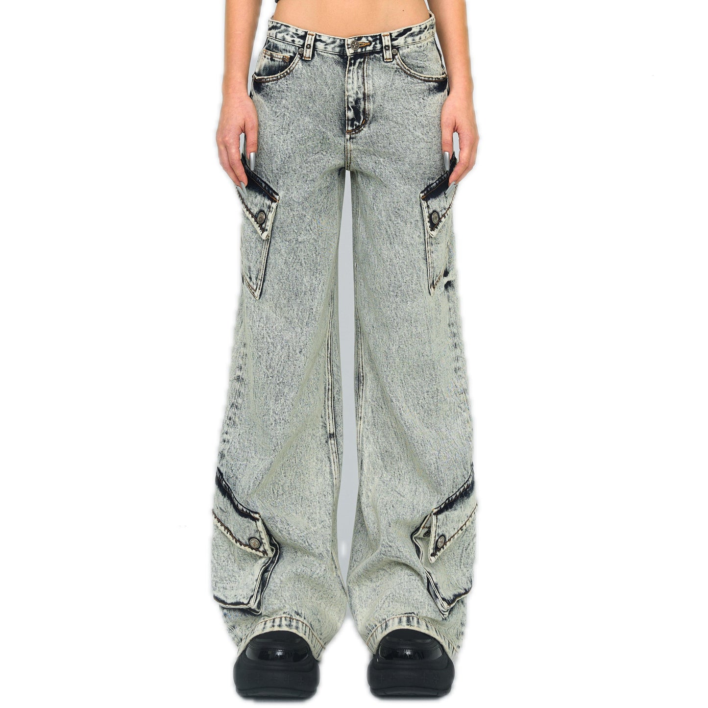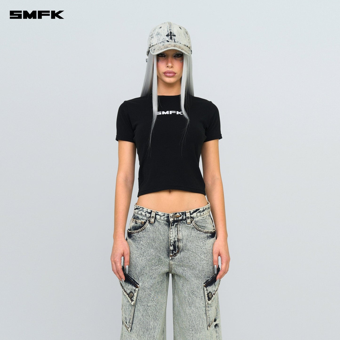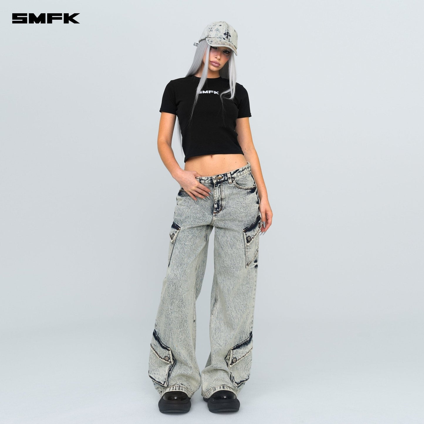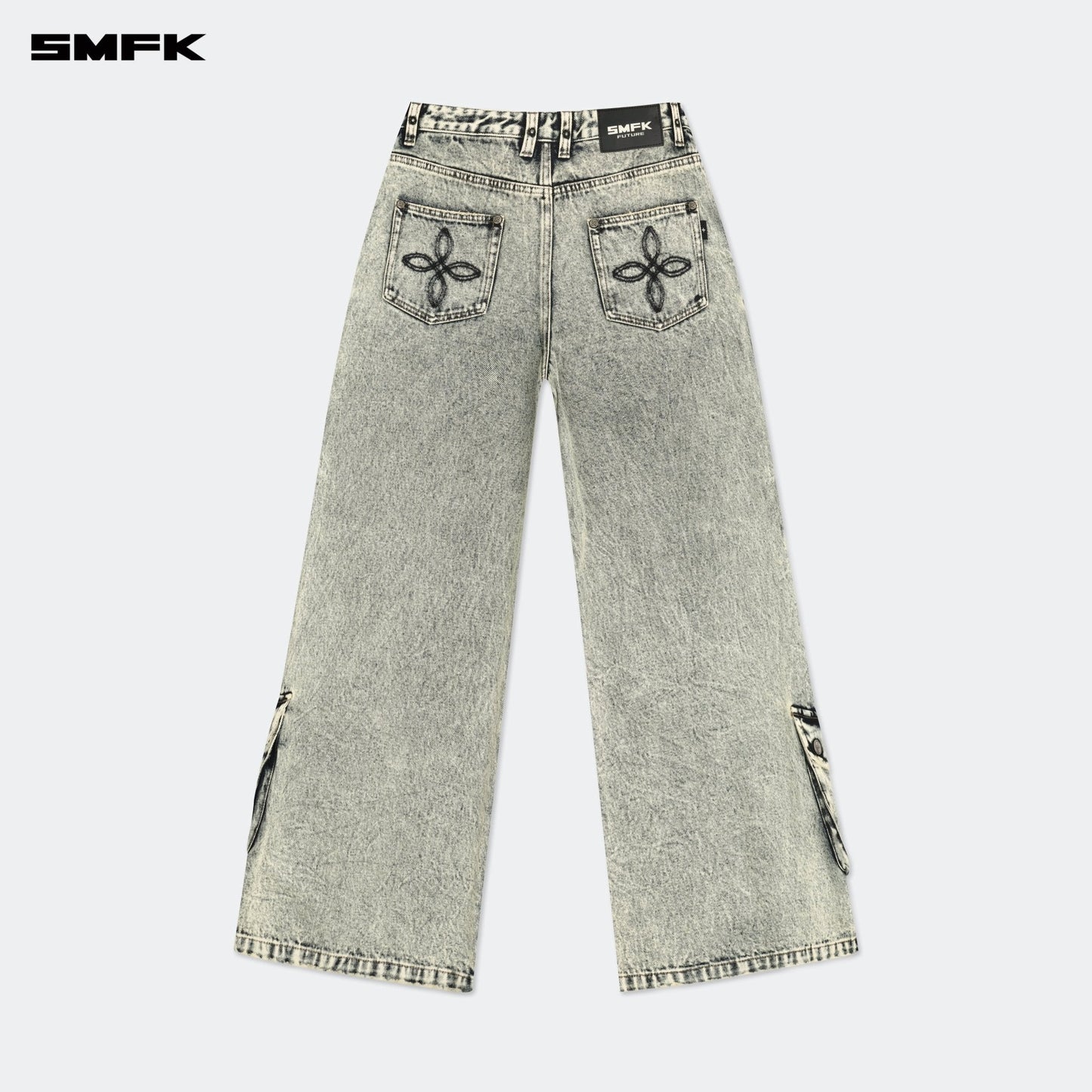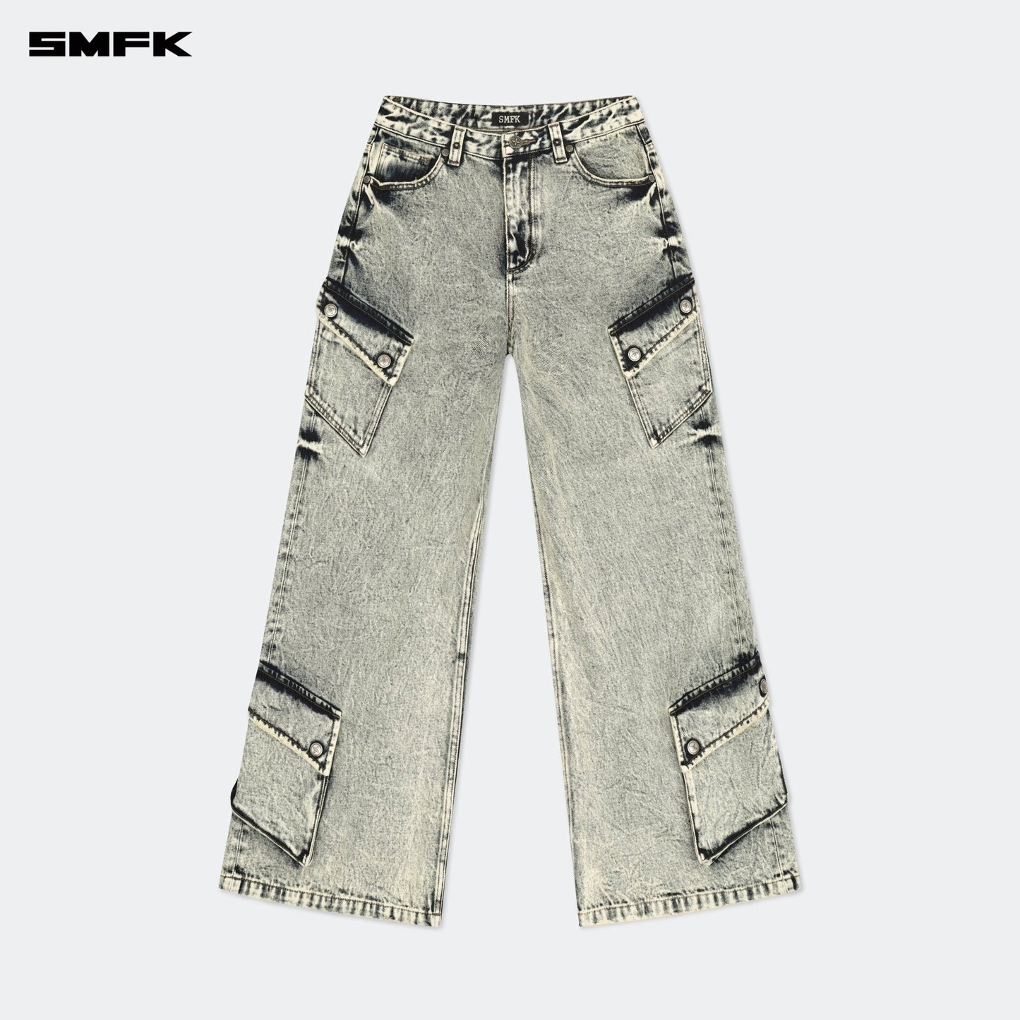 - Design: SMFK's newly designed mid-waist wide-leg jeans for 2024. The pocket design of workwear and military uniforms is combined with jeans. The newly designed special-shaped quadrilateral workwear flat pockets and three-dimensional pockets are tie-dyed on the waist and crotch to highlight the characteristics of the denim fabric and its washability. The SMFK logo is made of snowflakes and washed all over, and the color is inspired by a gray horse with white spots.