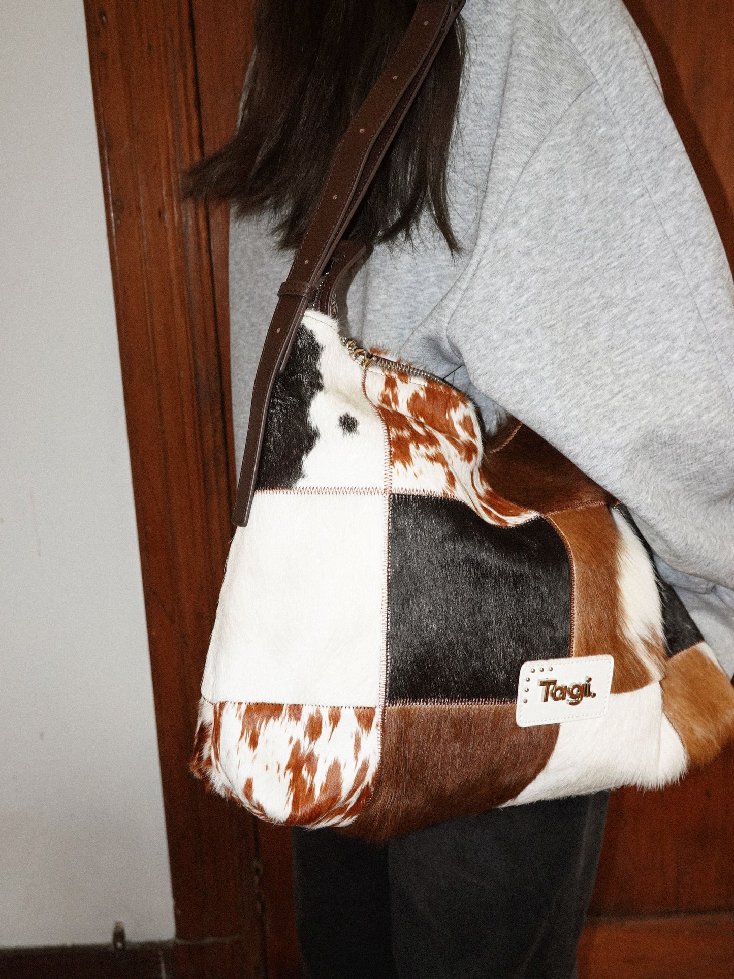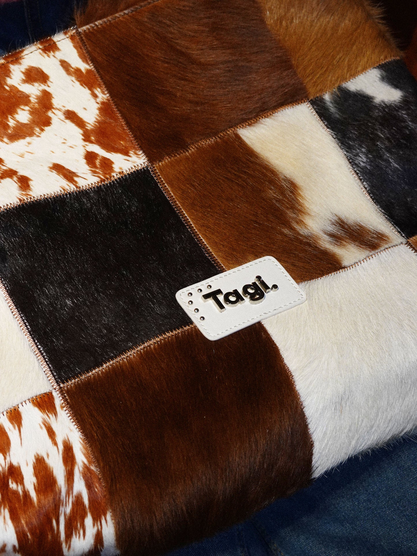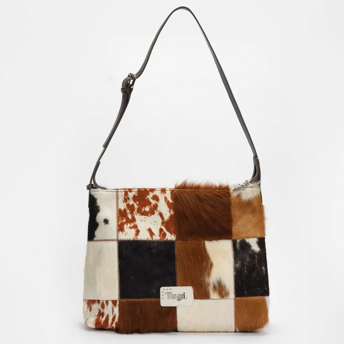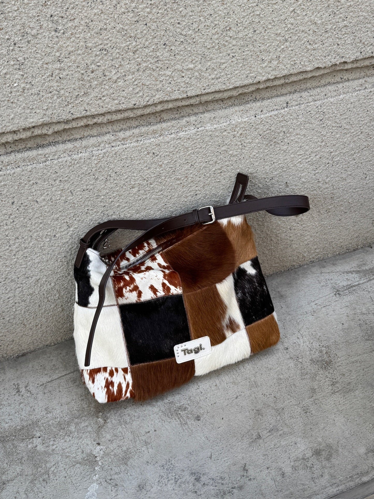 Bring the wild side of style with the Tagi. Imagine Cows Square Pattern Cross Bag, designed for those who love to add a bit of fun and sophistication to their wardrobe. Featuring a unique blend of cowhide and horsehair, this crossbody bag brings both luxurious texture and a bold design statement.