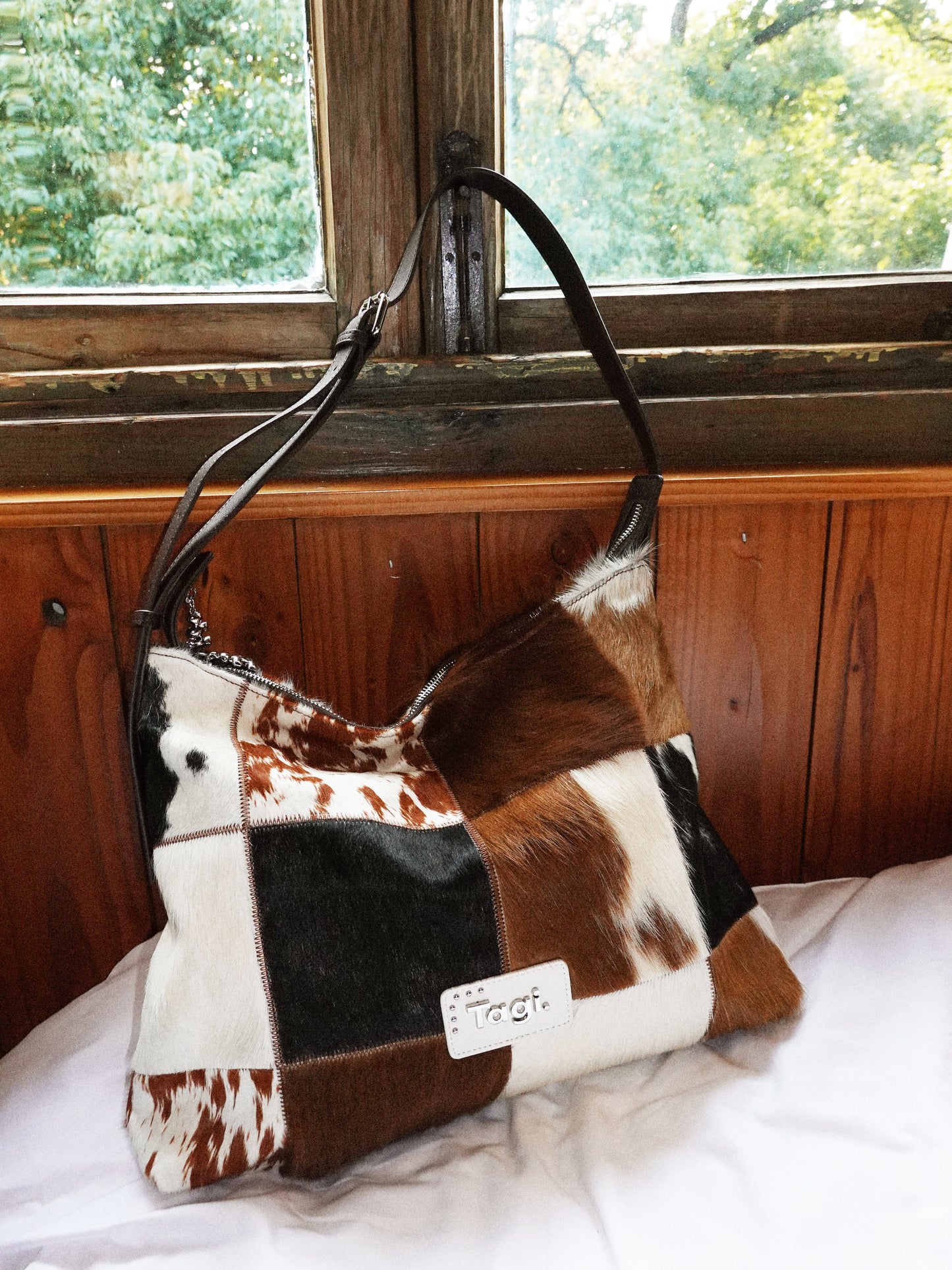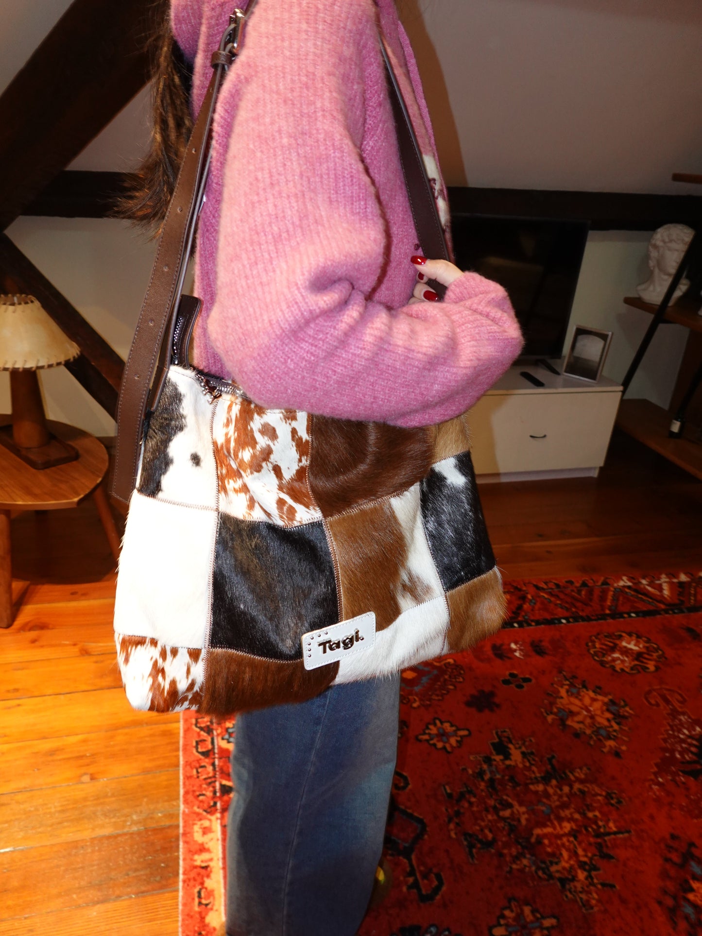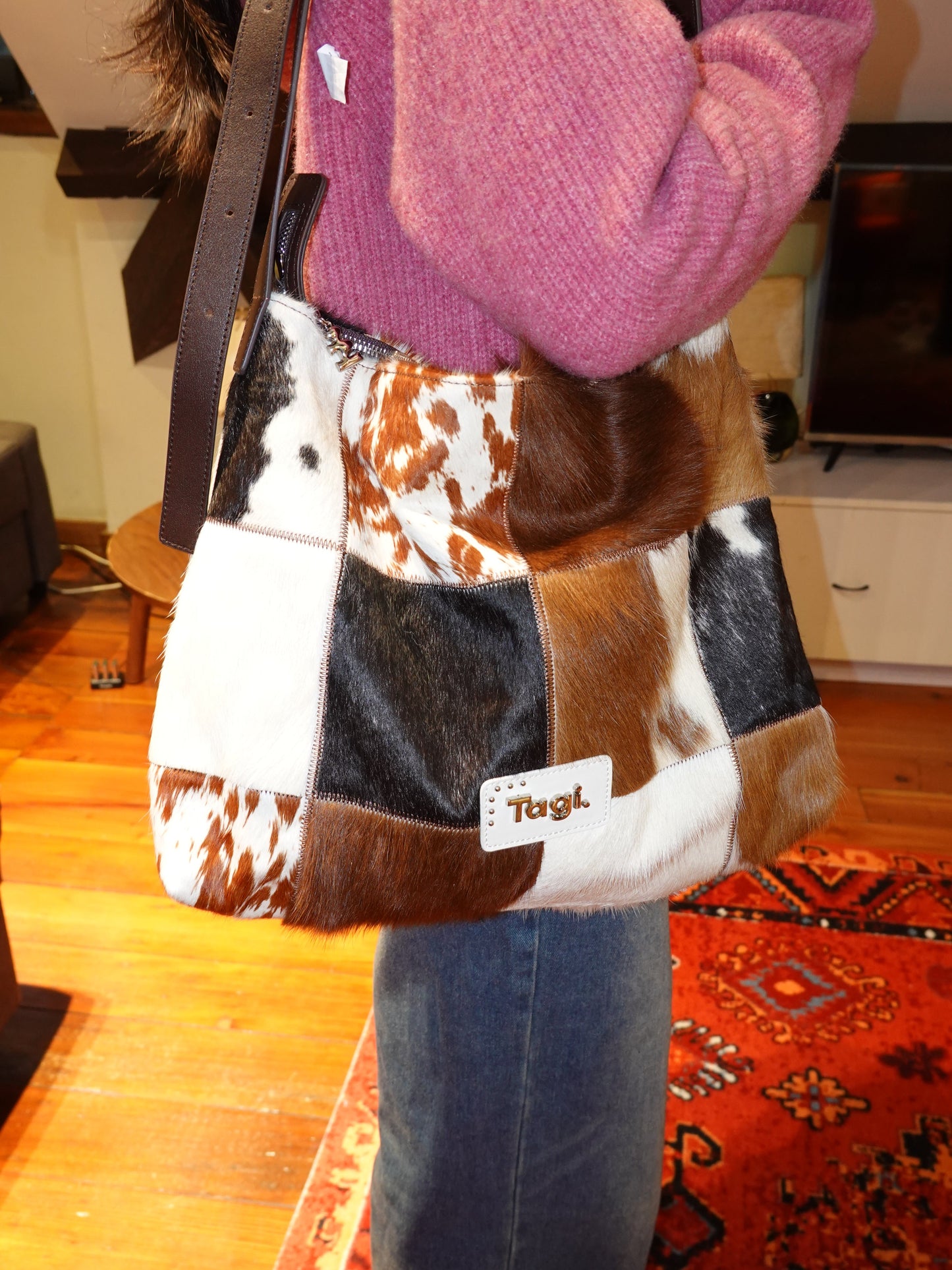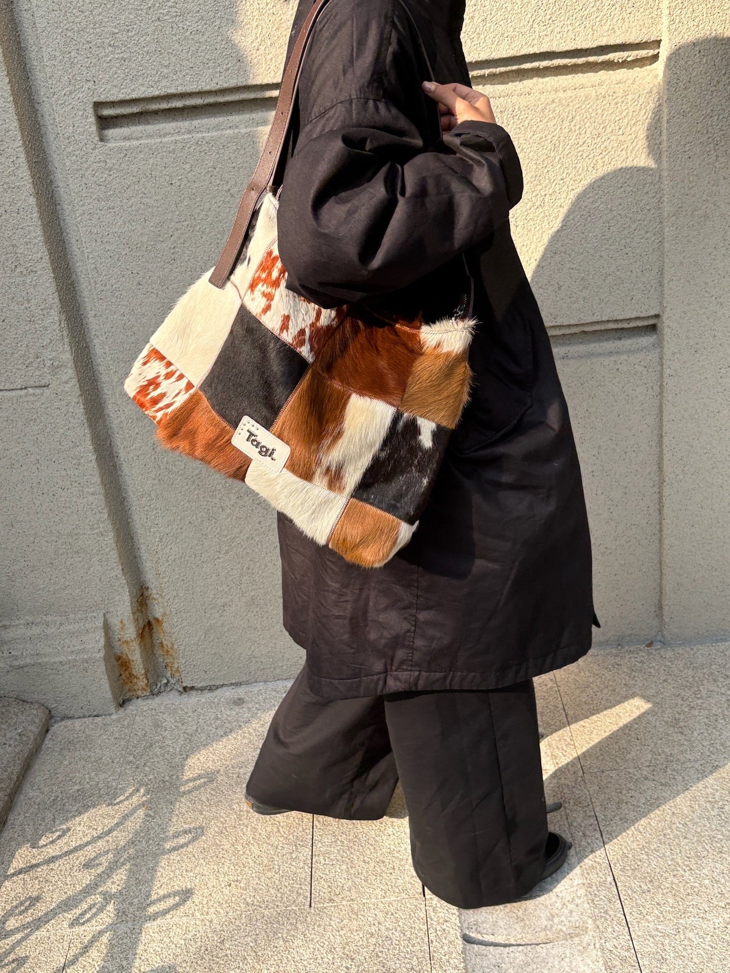 Bring the wild side of style with the Tagi. Imagine Cows Square Pattern Cross Bag, designed for those who love to add a bit of fun and sophistication to their wardrobe. Featuring a unique blend of cowhide and horsehair, this crossbody bag brings both luxurious texture and a bold design statement.