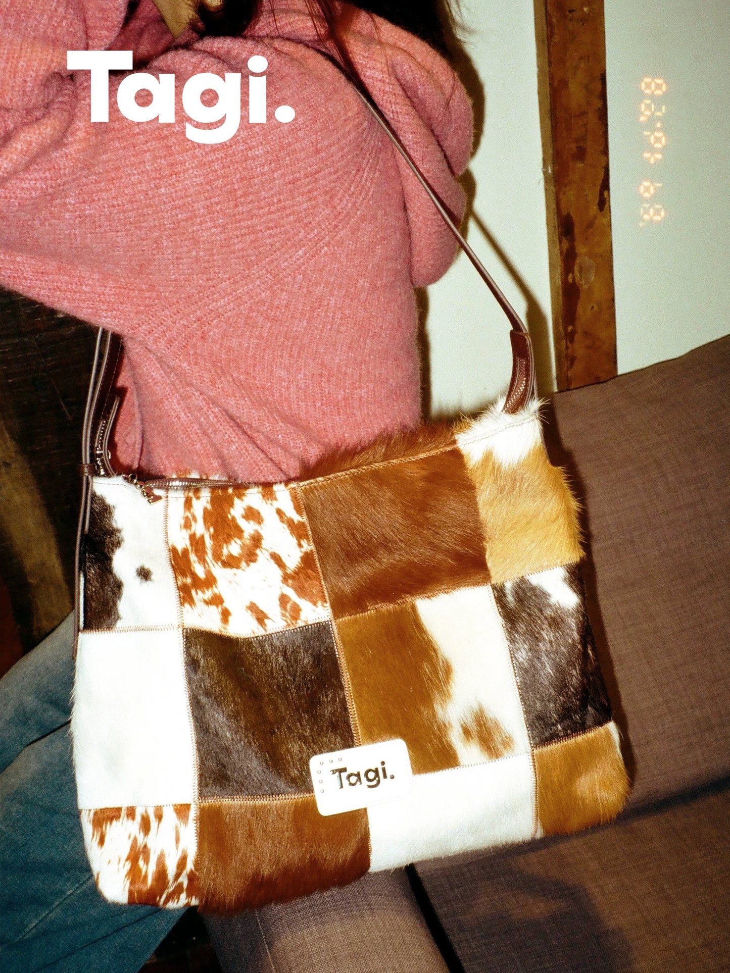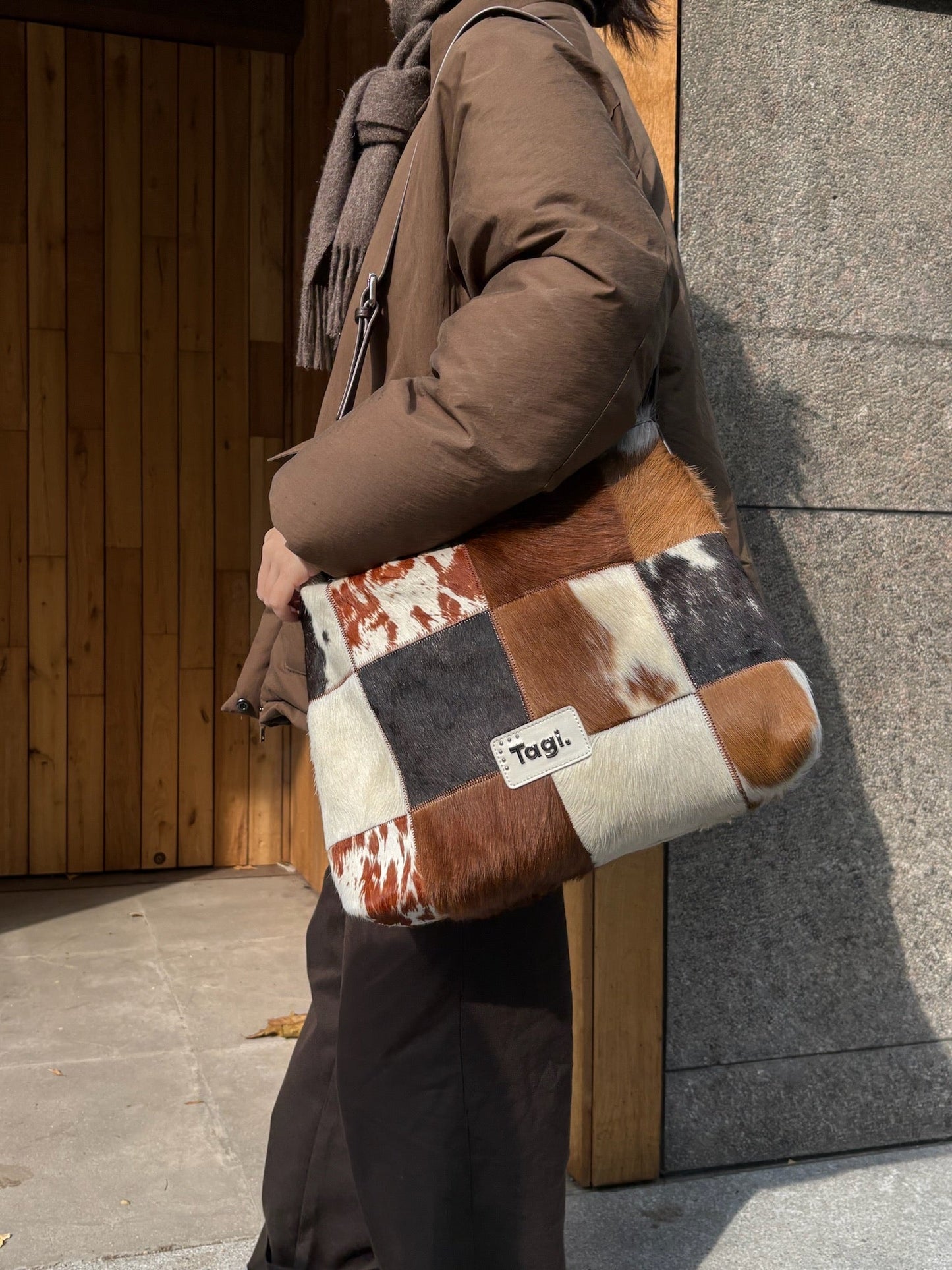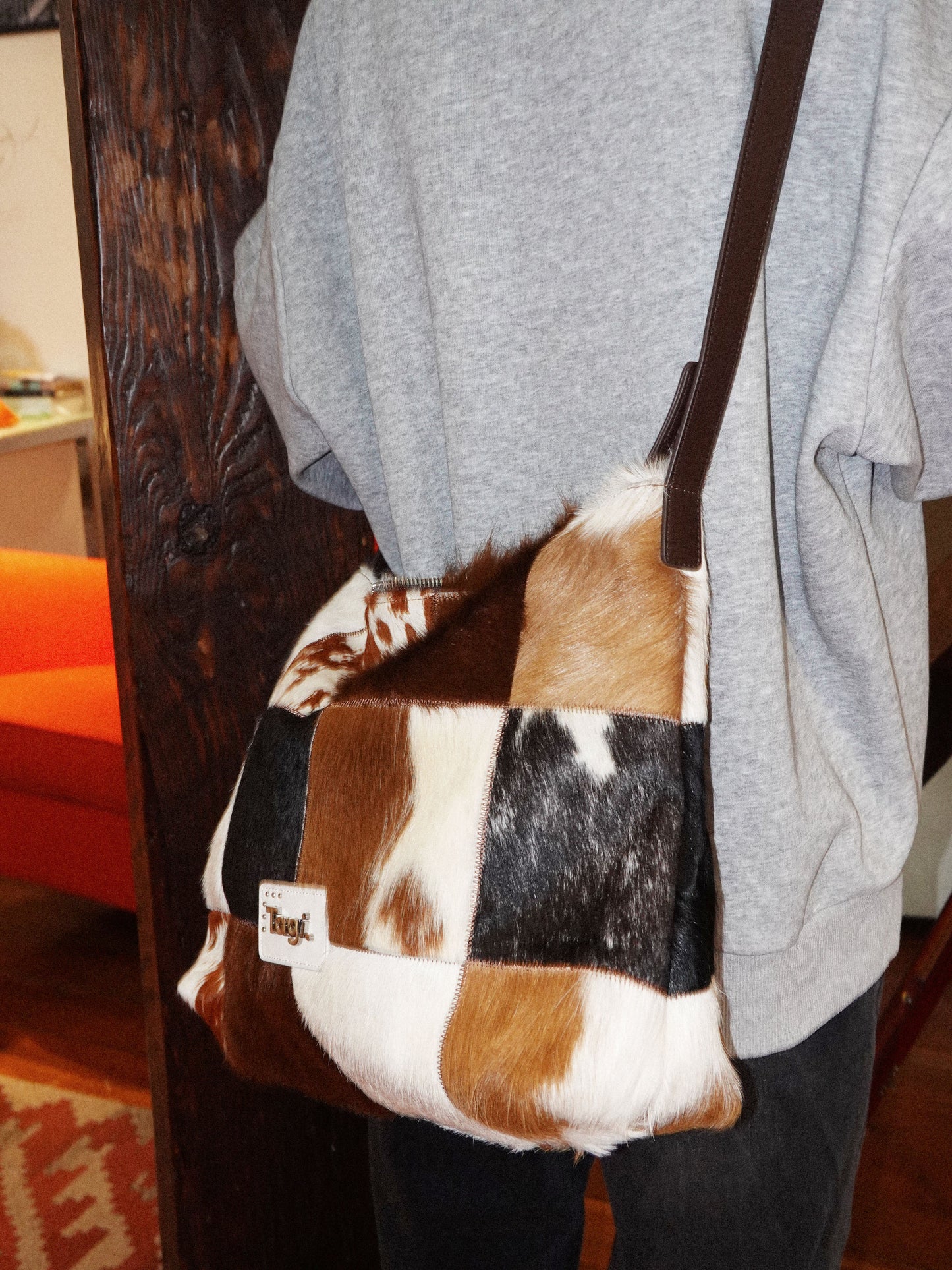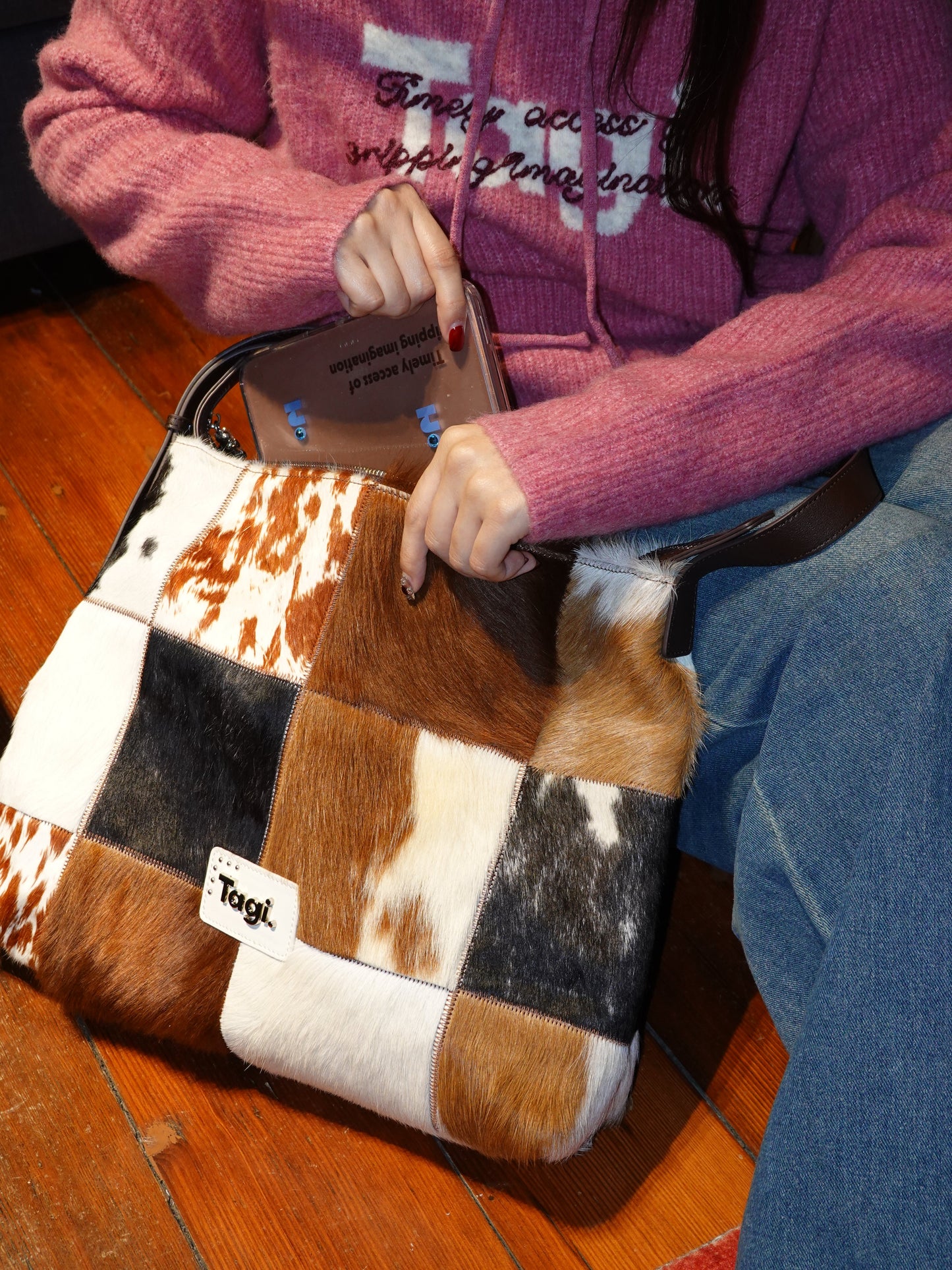 Bring the wild side of style with the Tagi. Imagine Cows Square Pattern Cross Bag, designed for those who love to add a bit of fun and sophistication to their wardrobe. Featuring a unique blend of cowhide and horsehair, this crossbody bag brings both luxurious texture and a bold design statement.