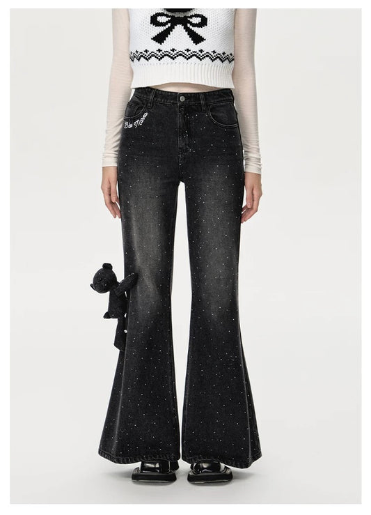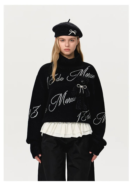 13DE MARZO Bear Rhinestone Logo Sweater Black