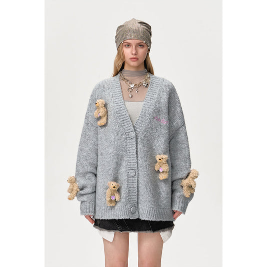 13DE MARZO Drilled Bear V-Neck Knit Cardigan Gray