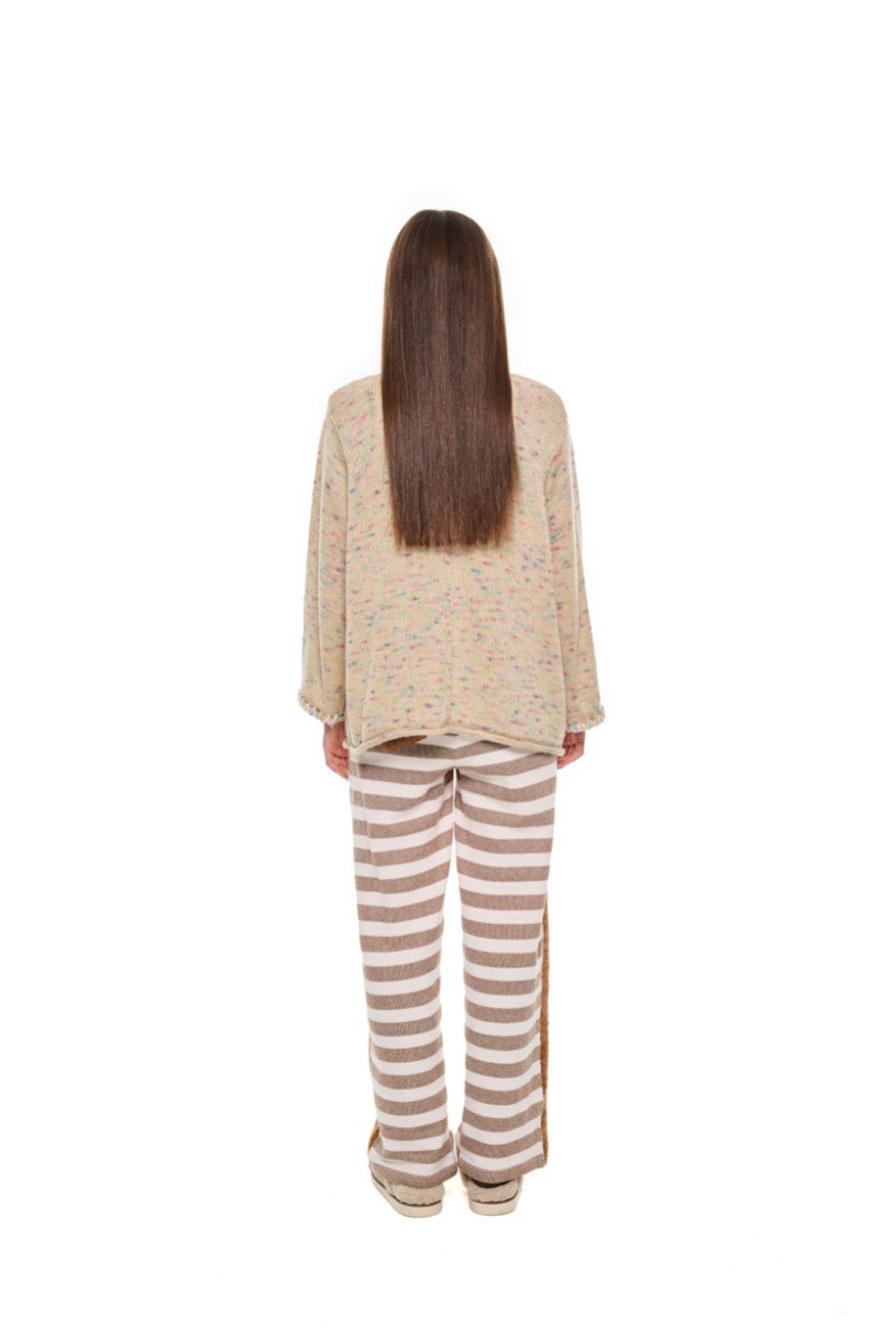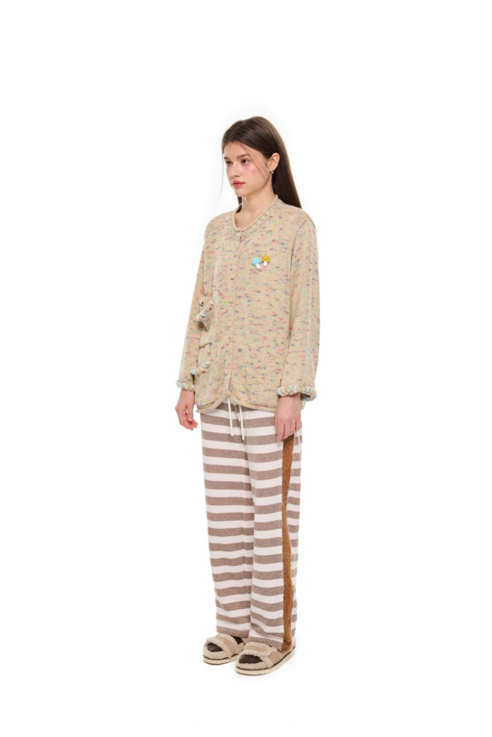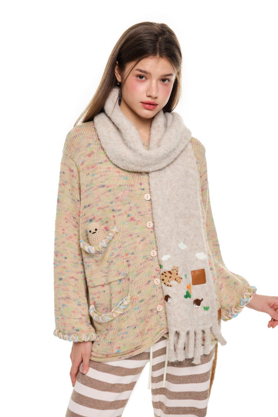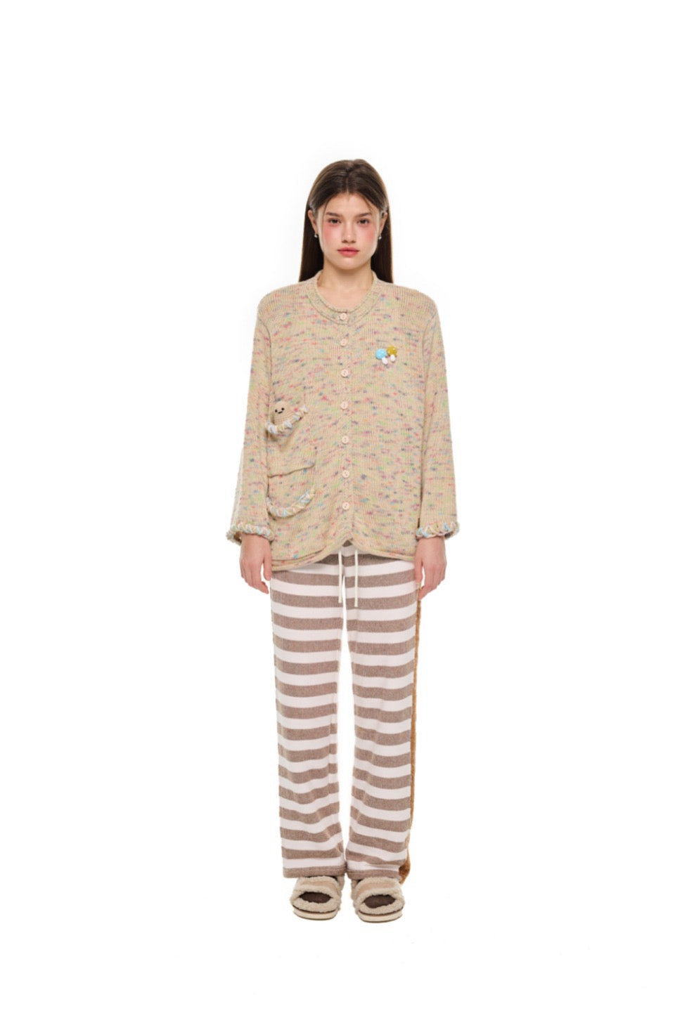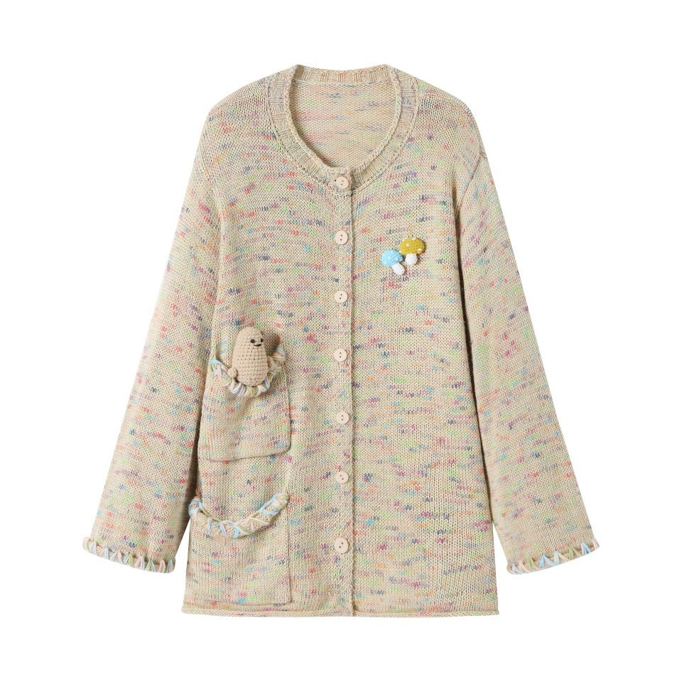 Andrea Martin Floral Yarn Crew Neck Wool Cardigan Khaki
