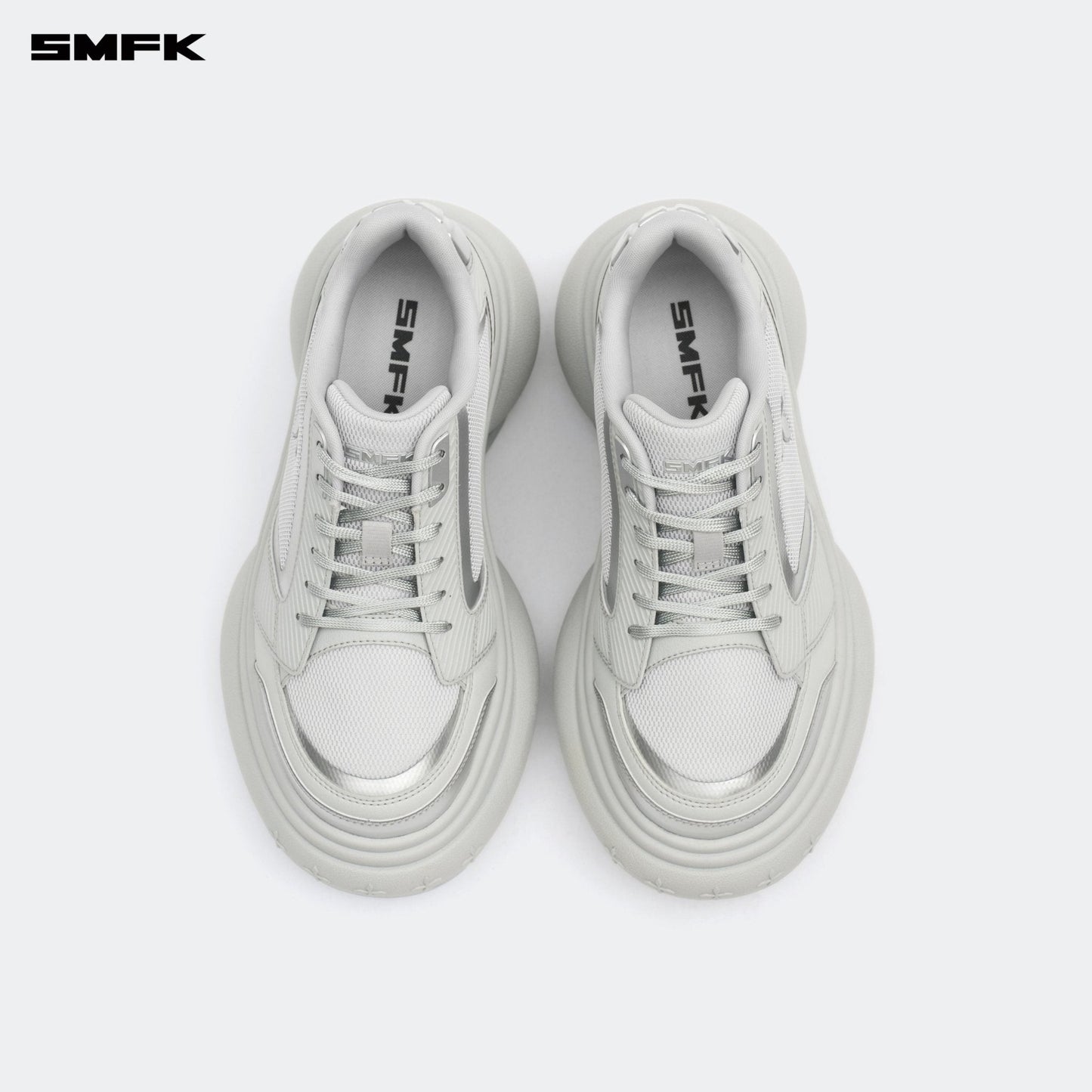 - Design: SMFK's brand-new design for 2024, the Ripple High Heel Athletic Shoes, is based on the high-heeled version of the SMFK WAVE slipper's sole design. The shoe upper adopts SMFK's futuristic ripple running shoe structure. Silver heat-melt material connects the elastic soft mesh areas with the stable meteorite pattern material sections. The medium-thickness inner sponge is designed for comprehensive sports activities and all-day use. The color scheme features a futuristic combination of light gray and silver-white.