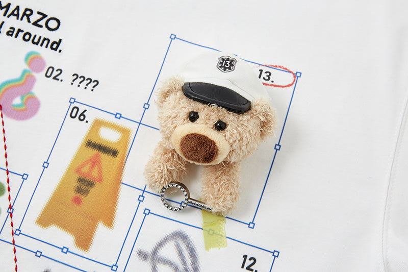This T-shirt is inspired by an investigator's clue board, as if the Detective Bear is piecing together case evidence, weaving the series narrative into the design. The pattern cleverly incorporates computer graphic selection frames, adding a modern and playful twist. Layered with embroidery that mimics connection lines and tape-like printed details, the graphic is rich, dimensional, and visually striking. A 3D Detective Bear charm is seamlessly integrated into the story, adding a touch of whimsy to instantly make your outfit more fun. With a relaxed, easy-to-wear fit, it's perfect for daily outings or casual hangouts, effortlessly creating a cool, personalized look.
