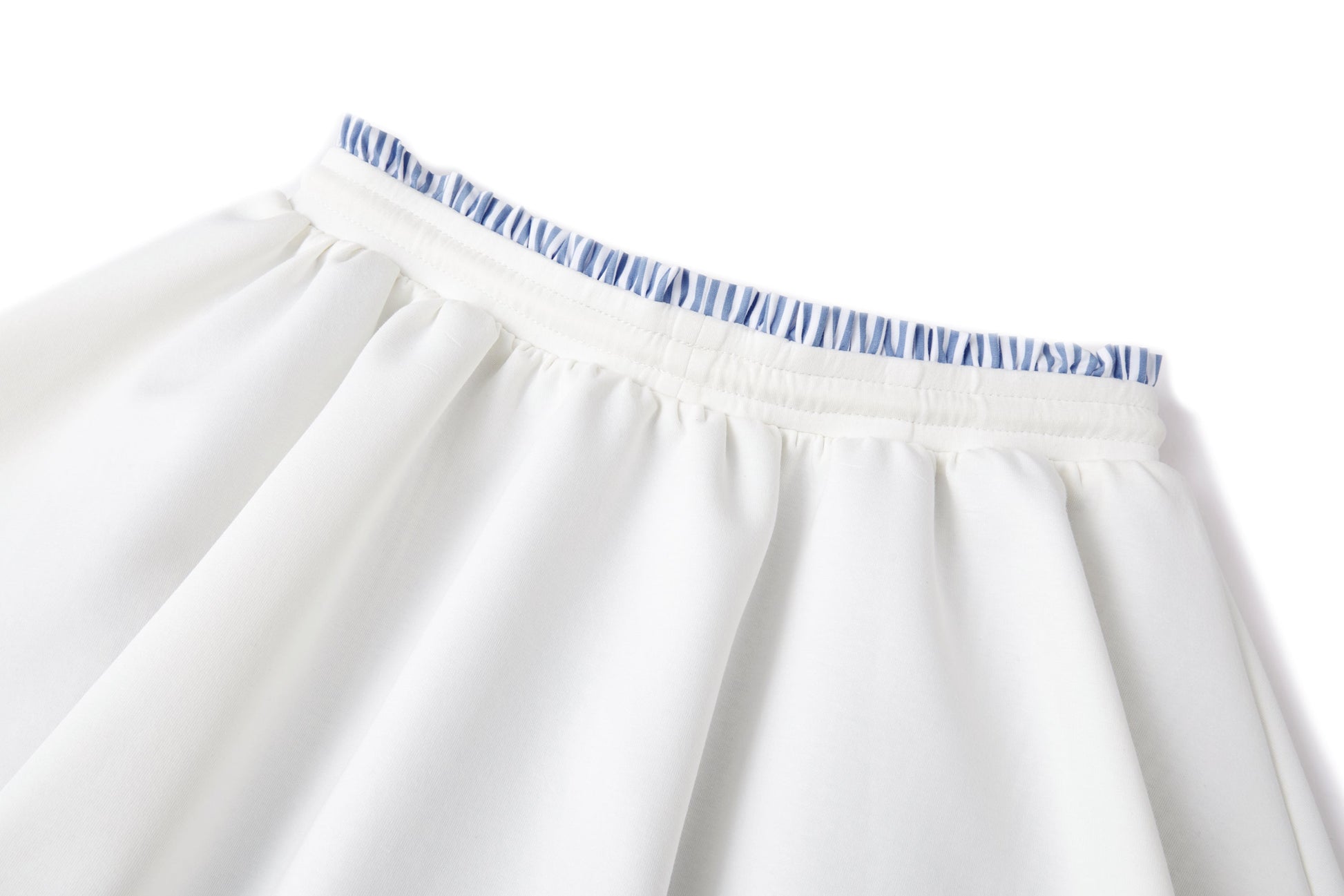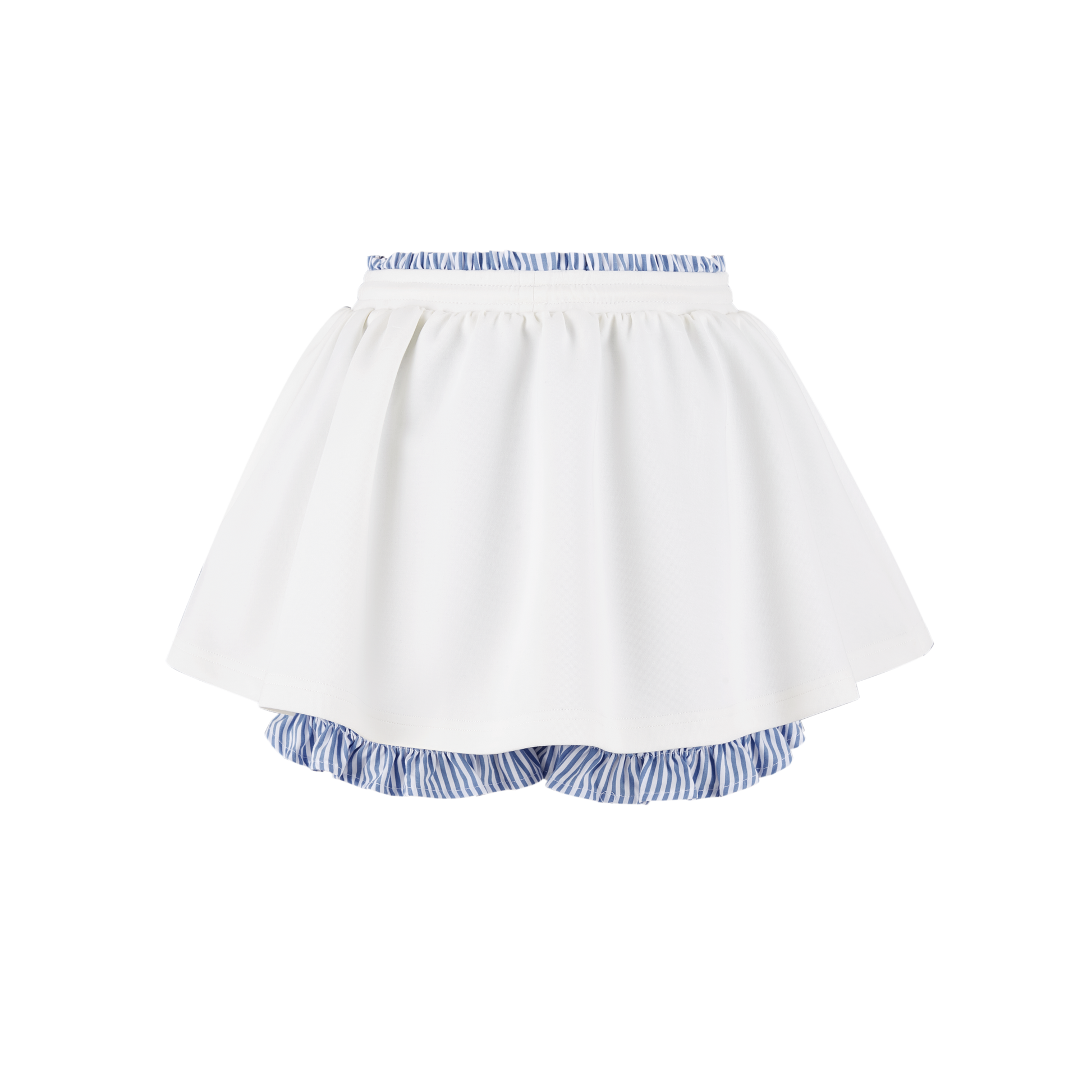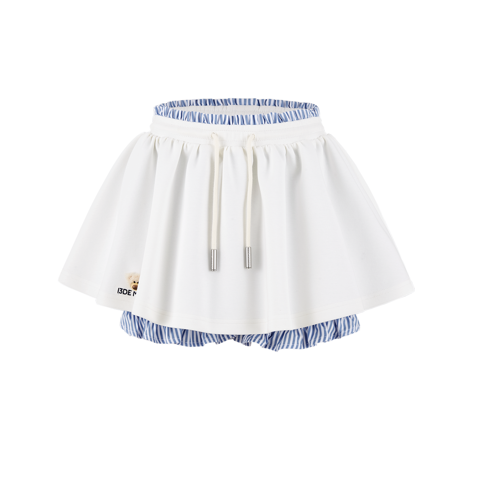This striped bloomer skirt merges the tailored neatness of shorts with the gentle drape of a skirt, creating a versatile everyday piece that balances practicality and style. The waistband and bloomer silhouette are accented with blue-and-white striped inserts—a classic pattern that adds fresh energy, breaks up solid tones, and builds visual depth. Cut with a three-dimensional bloomer shape, the waist sits snugly while the body flares softly, shaping the legs and smoothing curves for both a flattering look and comfortable wear. The hem is adorned with a mini plush bear head, adding playful dimension and a touch of sweet, summery charm.