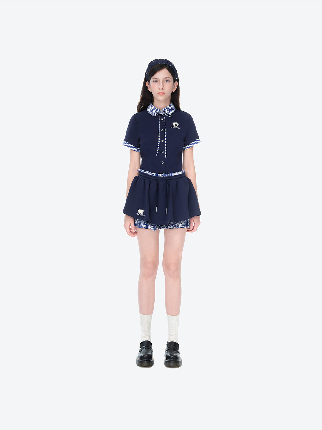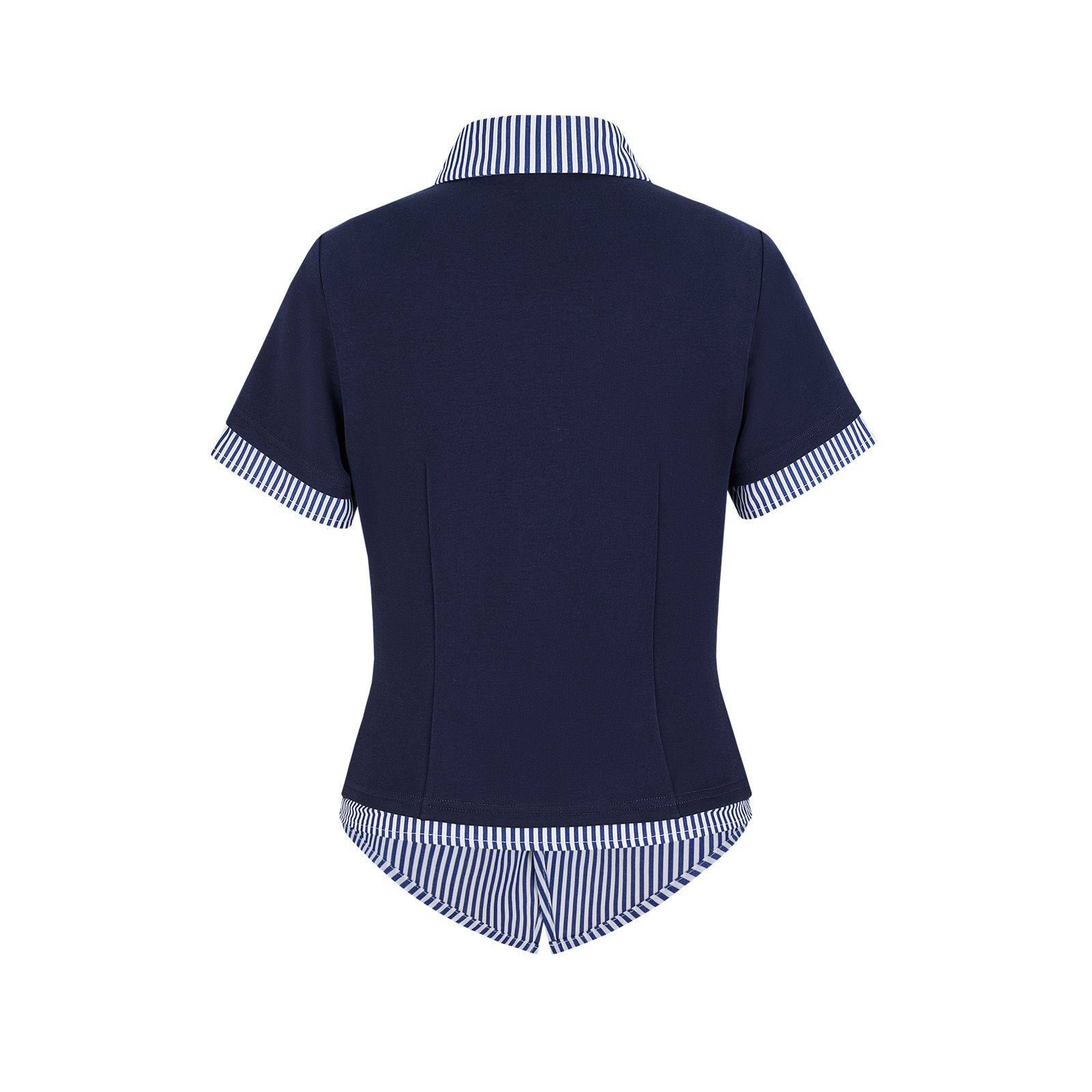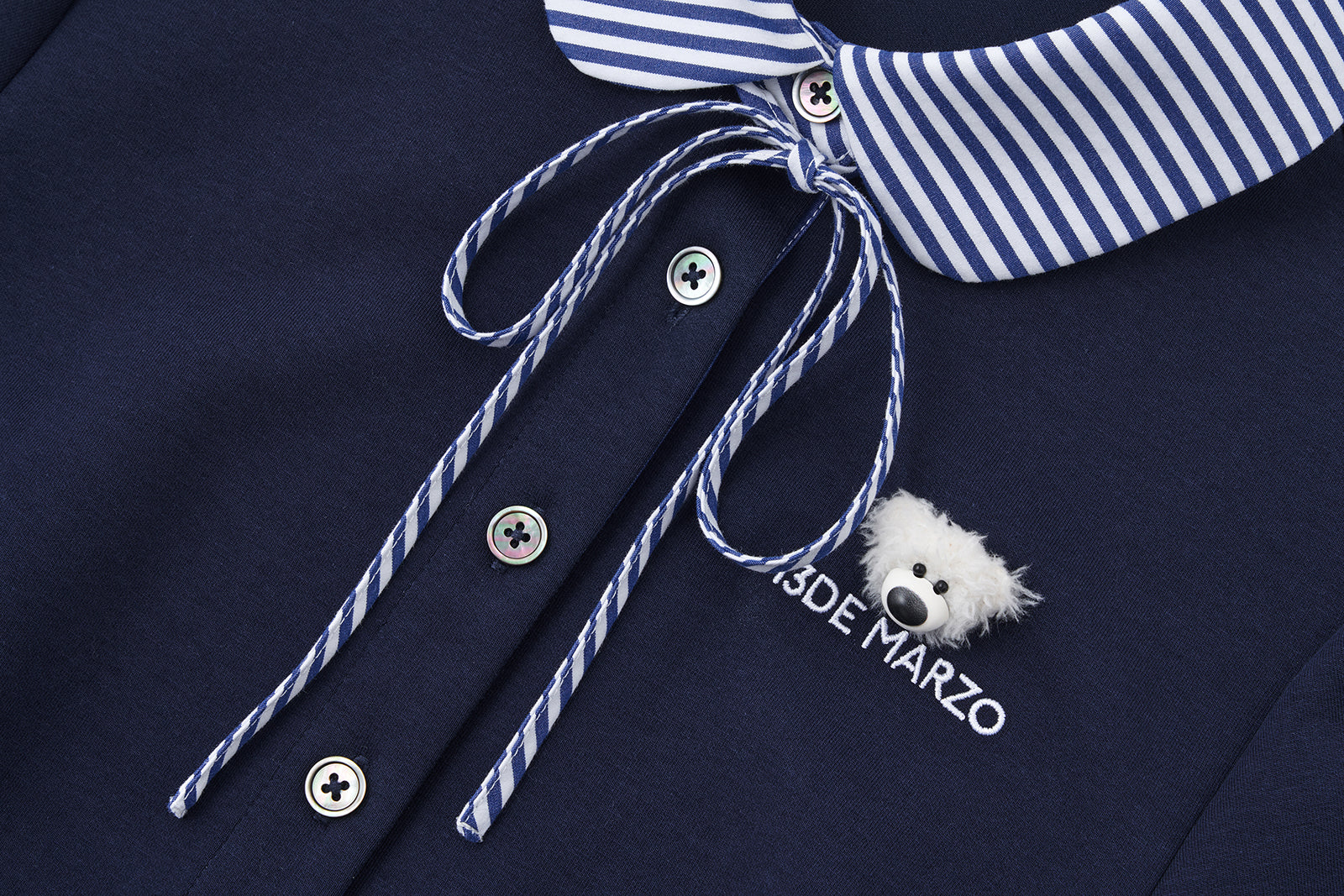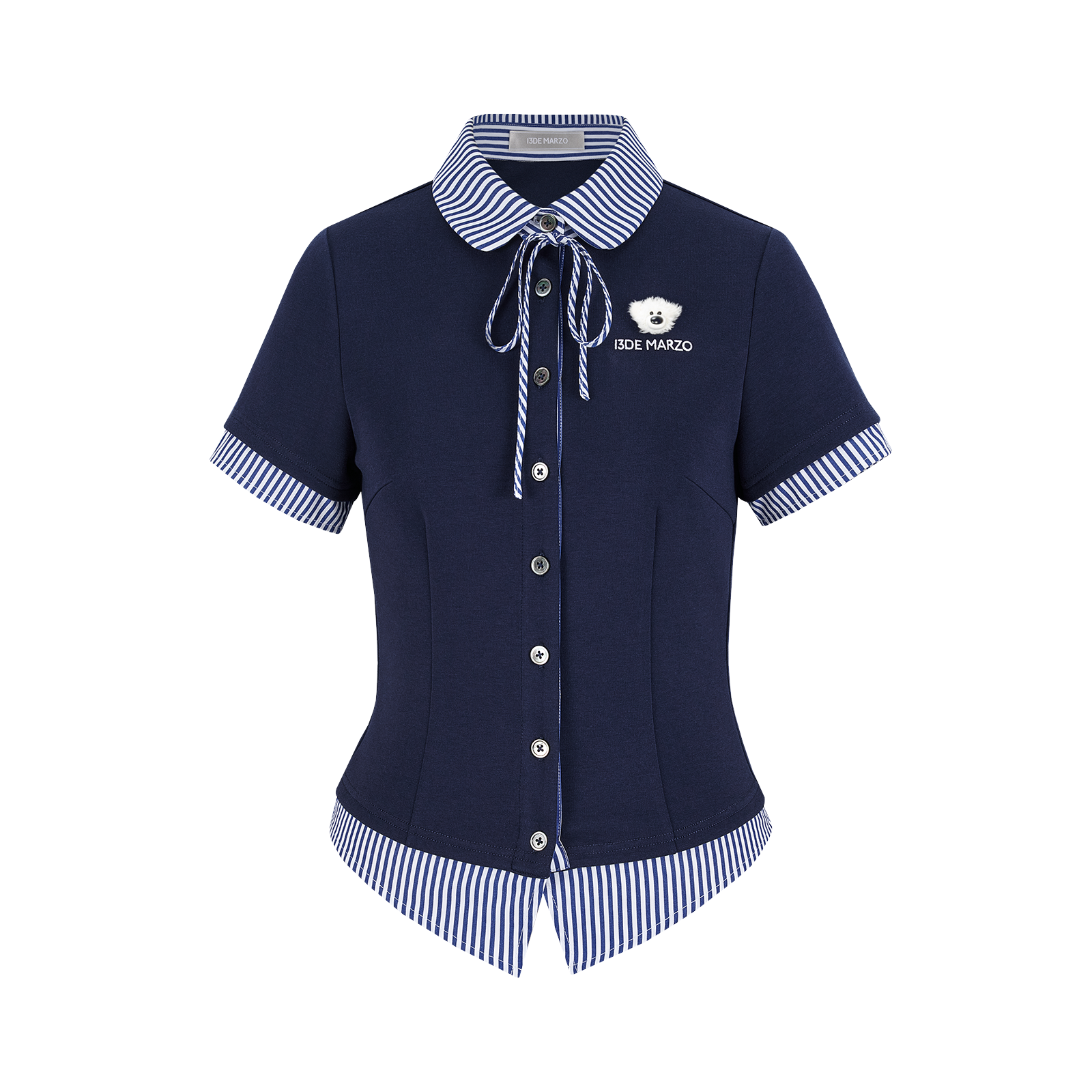 This striped panel shirt is crafted from a soft yet structured air-layered fabric, offering both comfort and premium texture. The classic blue-and-white stripes at the collar and hem break the solid color palette, infusing the look with fresh, energetic appeal. A mini plush bear head on the chest adds a cute, dimensional focal point—injecting playful charm and elevating the design sophistication.