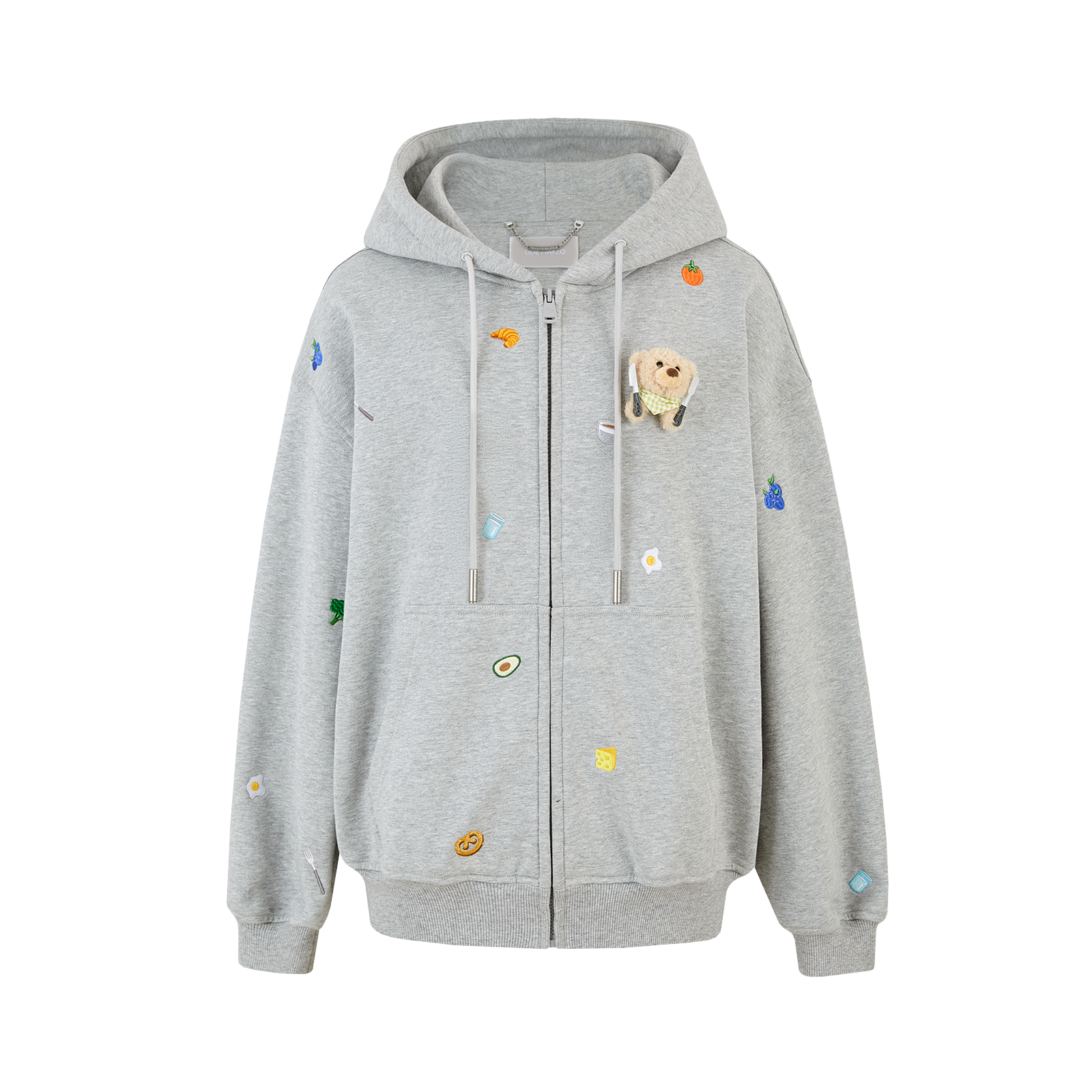 This sweatshirt masterfully blends streetwear casual vibes with playful food toy elements, its core appeal lying in the fusion of silhouette and creative detailing. The oversized, dropped-shoulder cut flatters various body types while cultivating a relaxed, street-style aesthetic. A full-zip front adds styling versatility, while the hood and kangaroo pocket retain classic休闲attributes. The front features dimensional embellishments paired with colorful food toy patches, creating a striking focal point that echoes the coordinating baseball cap design. Available in three muted tones—gray, off-white, and grass green—this piece uses high-gram-weight terry cotton for a soft yet structured feel, balancing comfort with visual impact. A statement piece perfect for everyday wear.