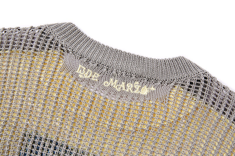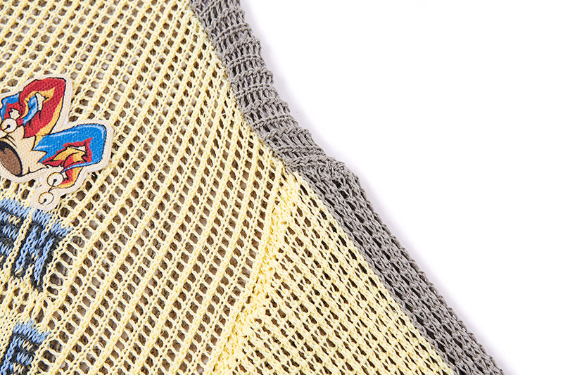This openwork knitted sweater is crafted using a hollow-knit technique, creating a fine mesh texture with a distinctive sense of lightness and transparency. Highly breathable and airy, it offers a comfortable wearing experience with a subtle see-through effect. The front features colorful graphic prints and English text, incorporating elements such as masks and dolls. The rich yet harmonious color palette adds artistic depth and a cultured, expressive character to the design.