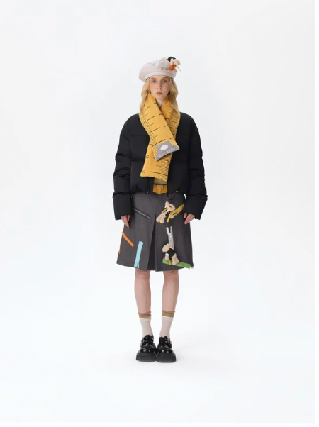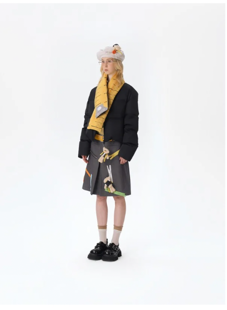This down jacket merges brand identity, creativity, and functionality into one statement piece. The signature teddy bear charm—attached at the zipper pull—infuses the design with a playful and distinctive personality, instantly setting it apart from conventional down outerwear. The bright yellow knitted tape, skillfully spliced with the glossy down fabric, introduces a novel visual contrast, enhancing the sense of dimension and modernity.