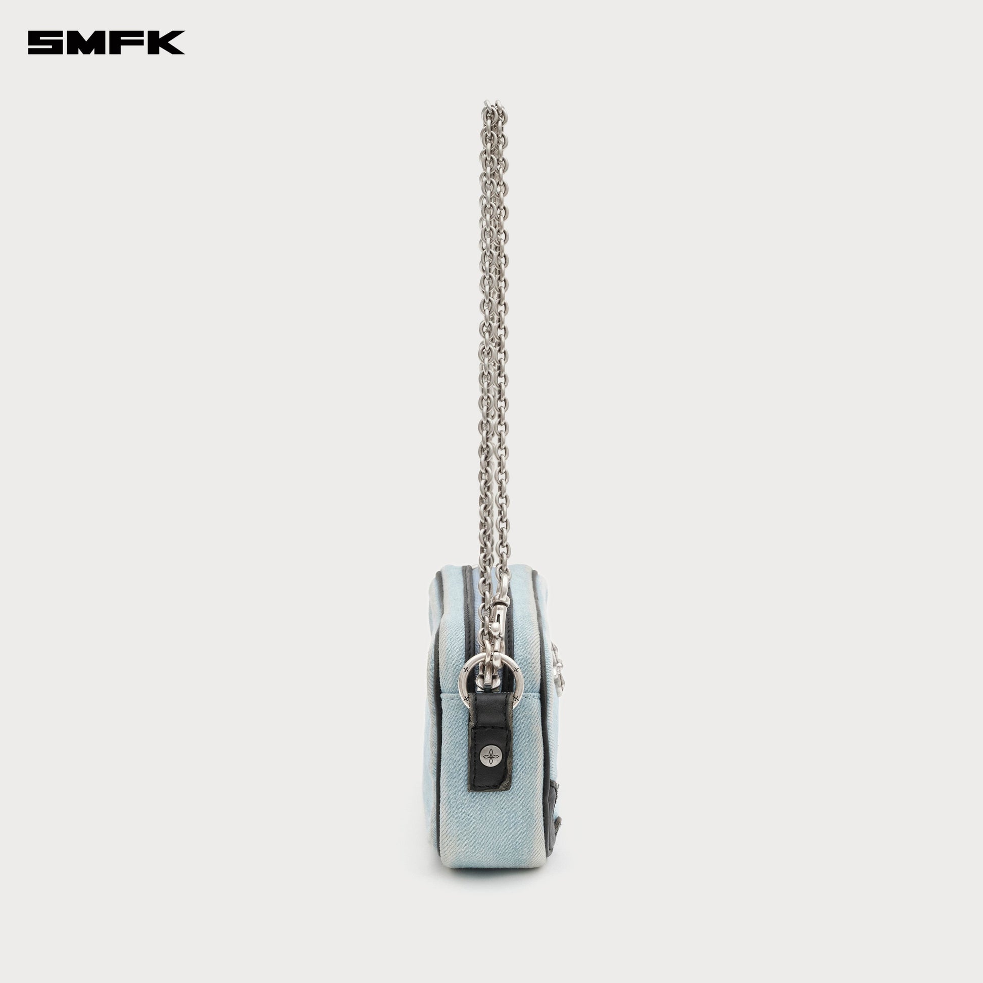 - Design: SMFK KITTY shoulder bag, a combination of sky blue denim and leather, with black leather piping. The denim edges of the bag are hand-faded, showing a warm white retro denim base. The COMPASS BADGE bright antique silver metal cross badge is inlaid in the center of the bag.