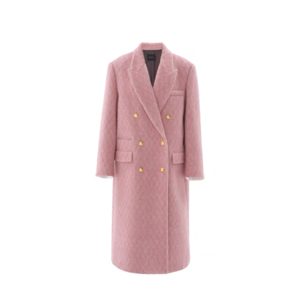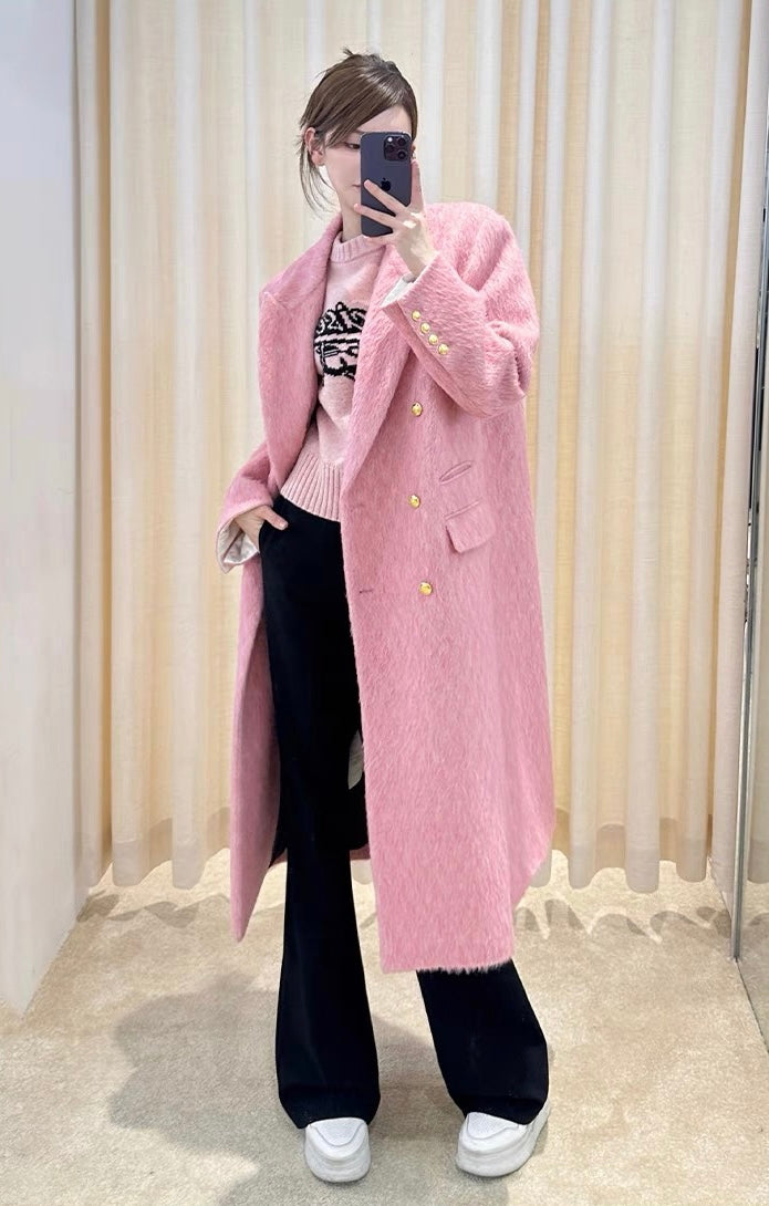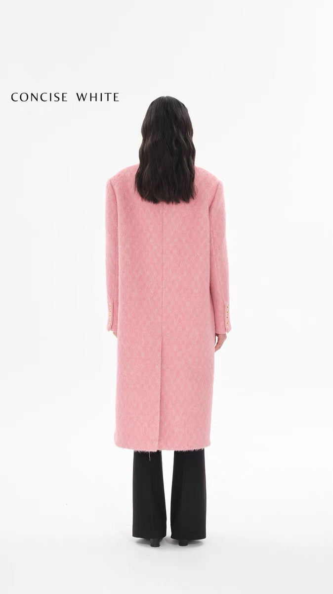 Concise-White Double-Breasted Gold Buckle Long Coat Pink