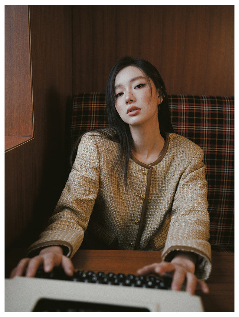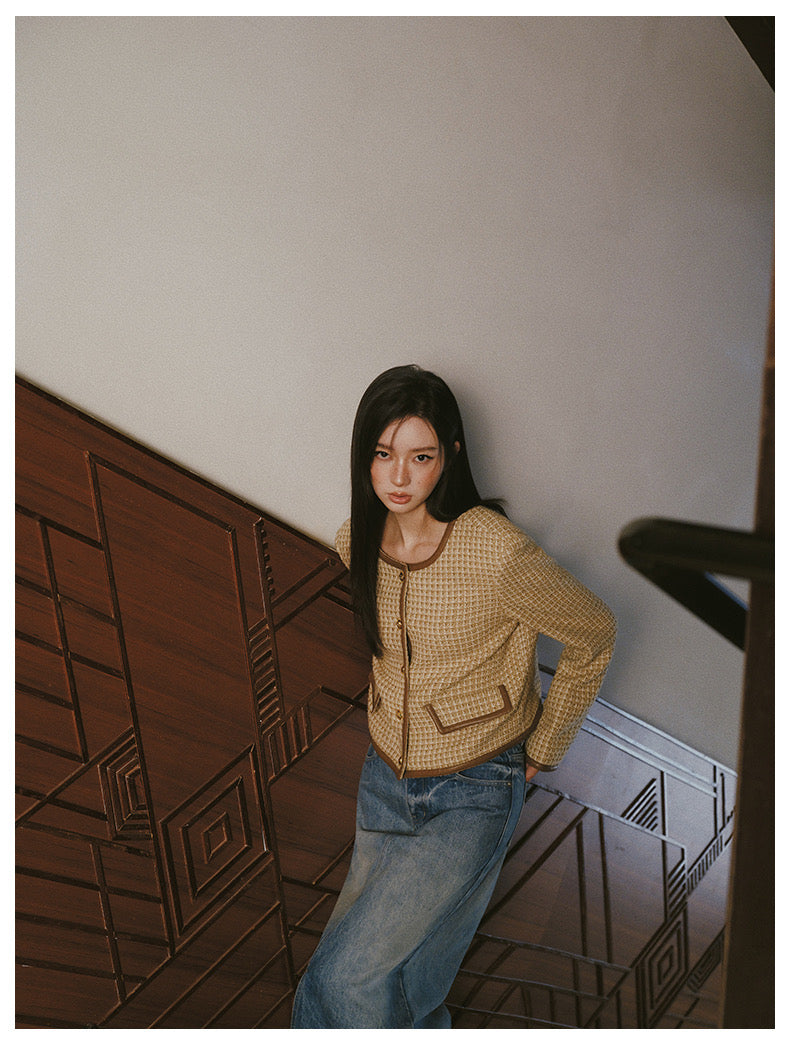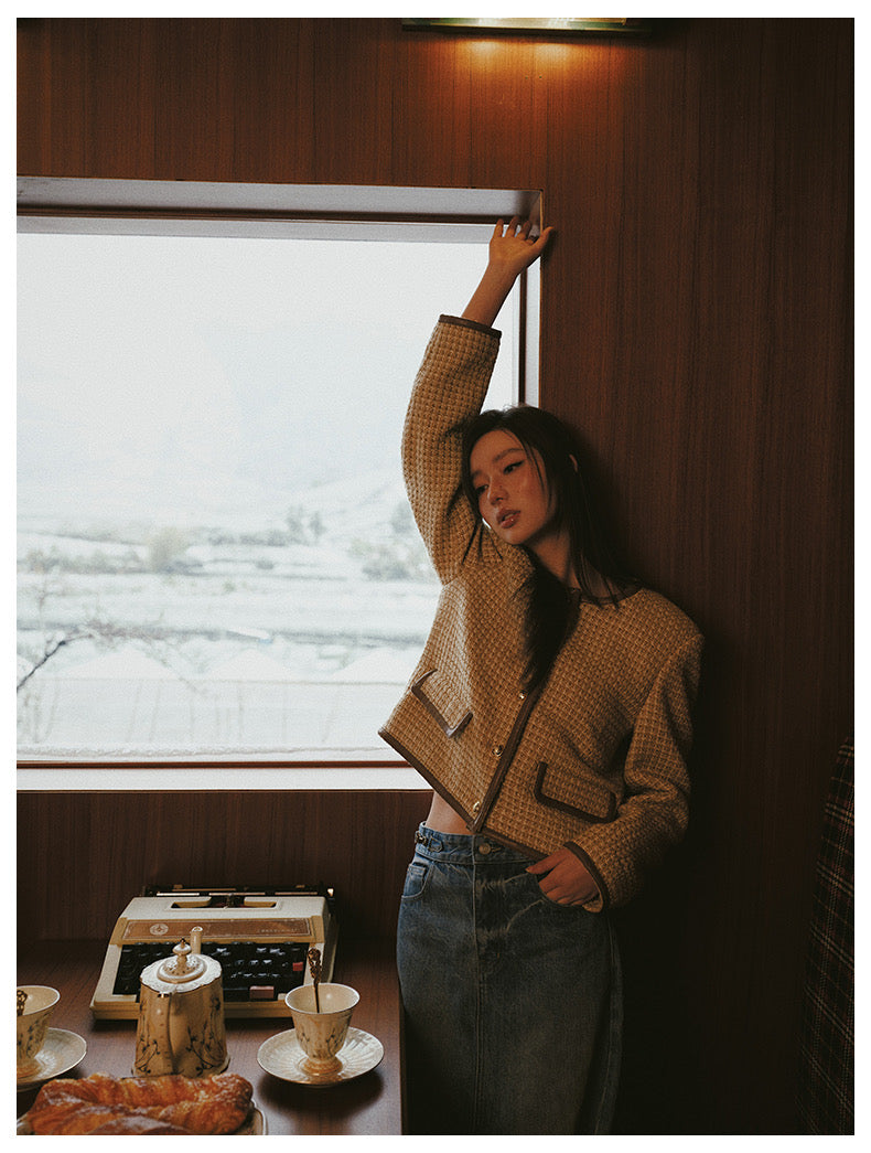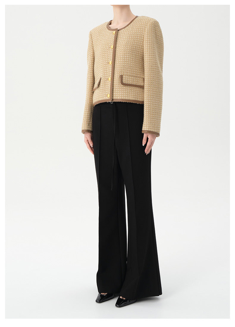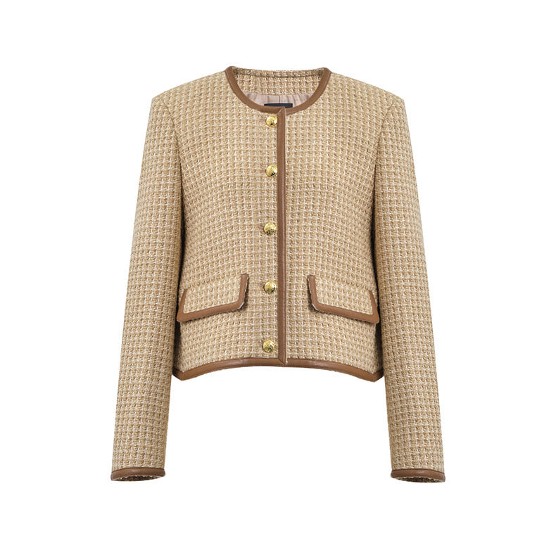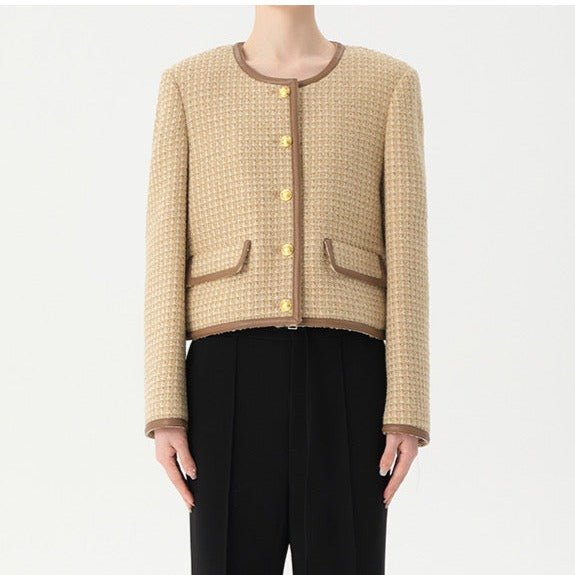 Concise-White Patch Tweed Gold Buckle Short Coat Khaki