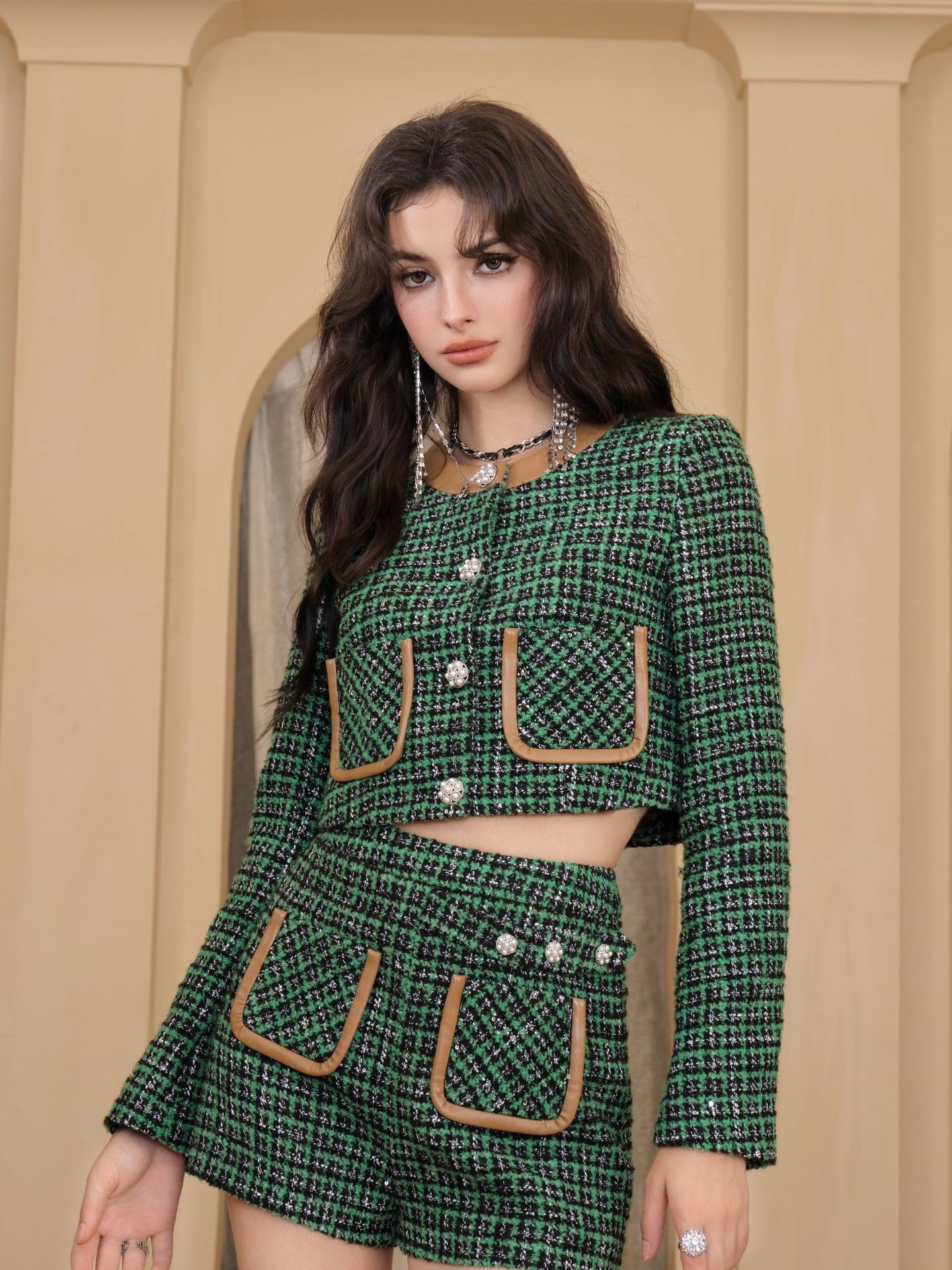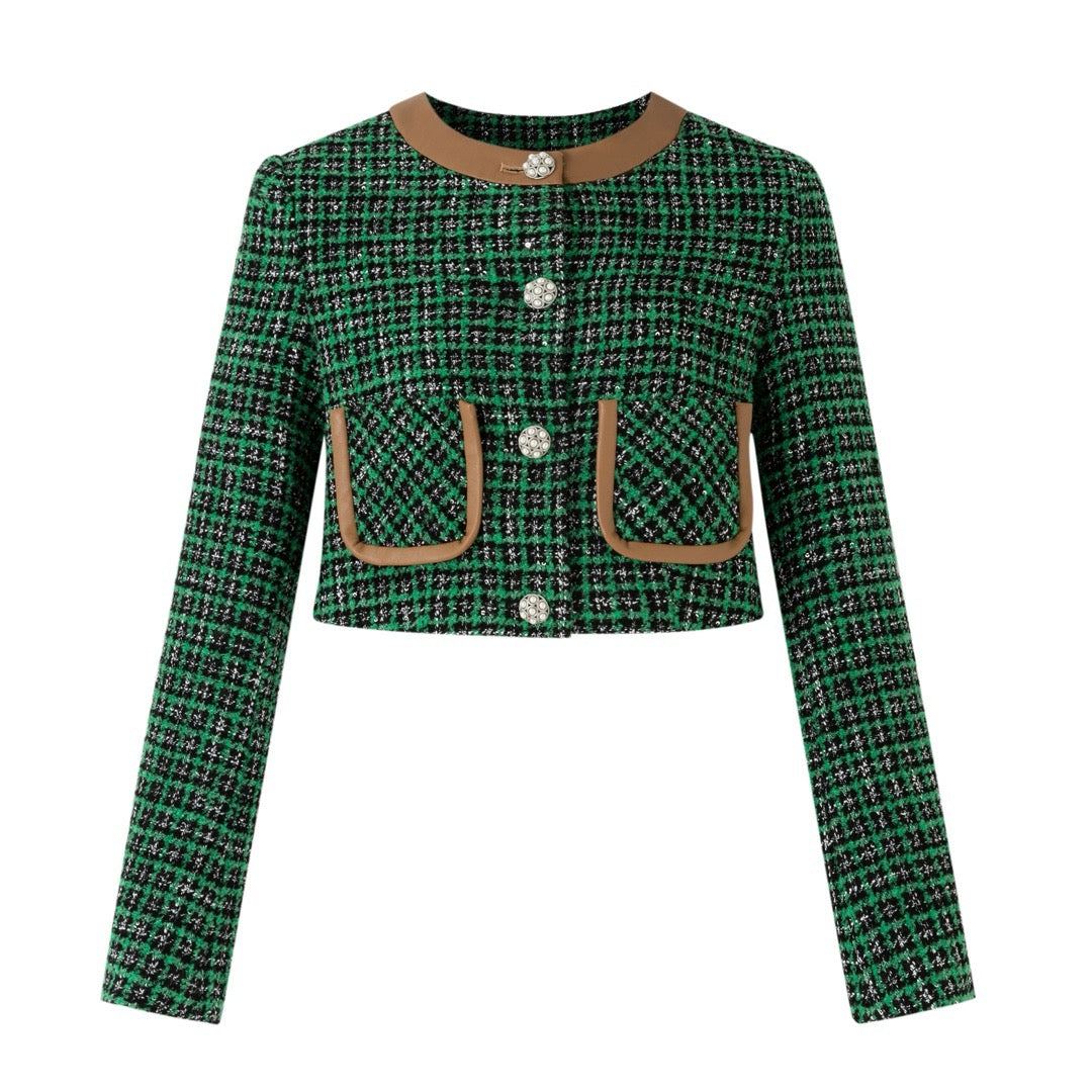 DIANA VEVINA Plaid Tweed Pearl Button Jacket Green