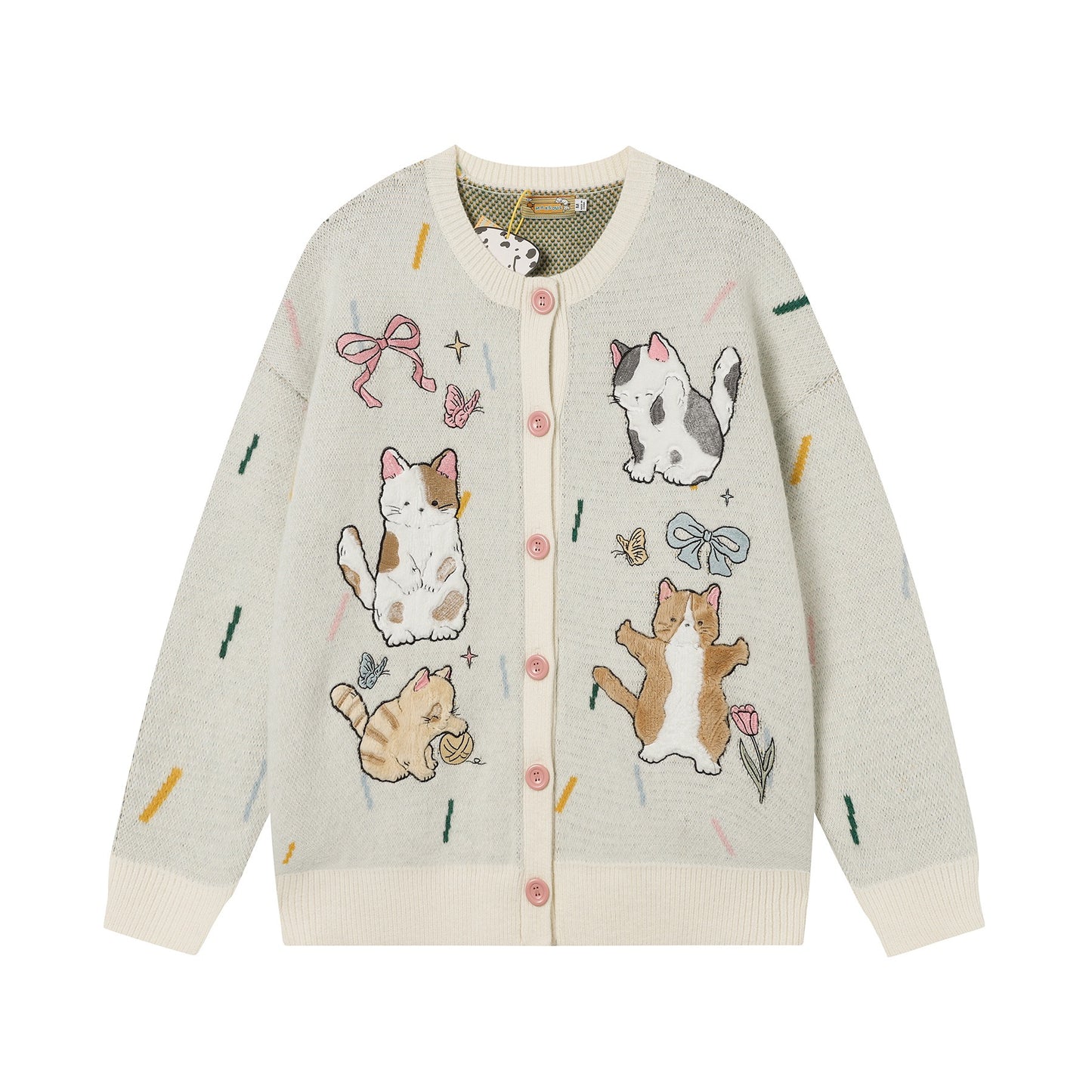 ✦FX✦ Cute Kitten Embroidered Striped Knit Cardigan White