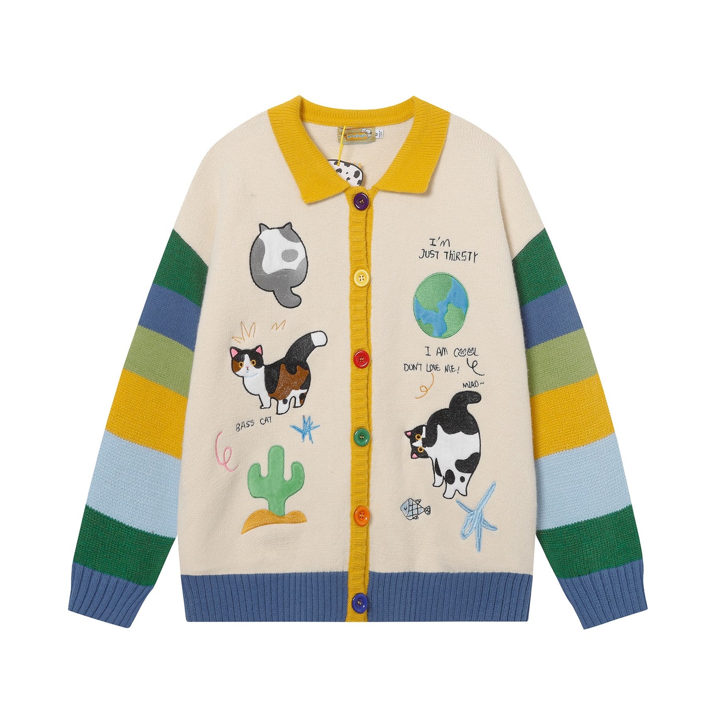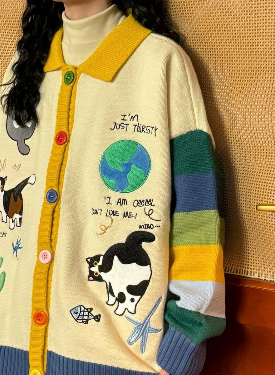 ✦FX✦ Retro Kitten Embroidered Striped Knit Cardigan Beige