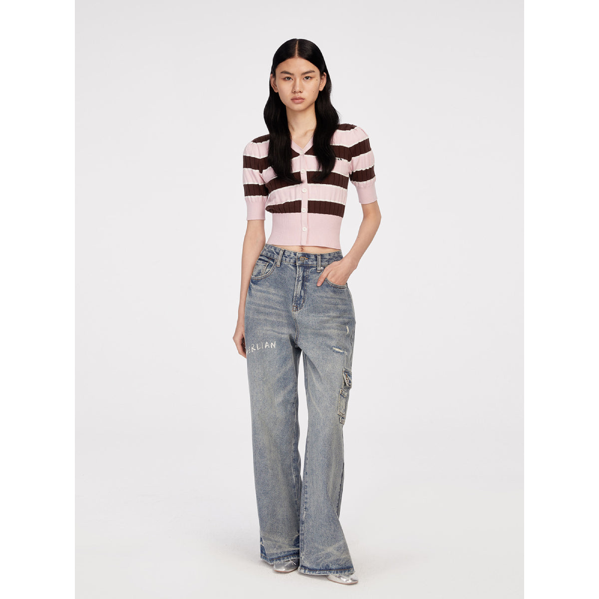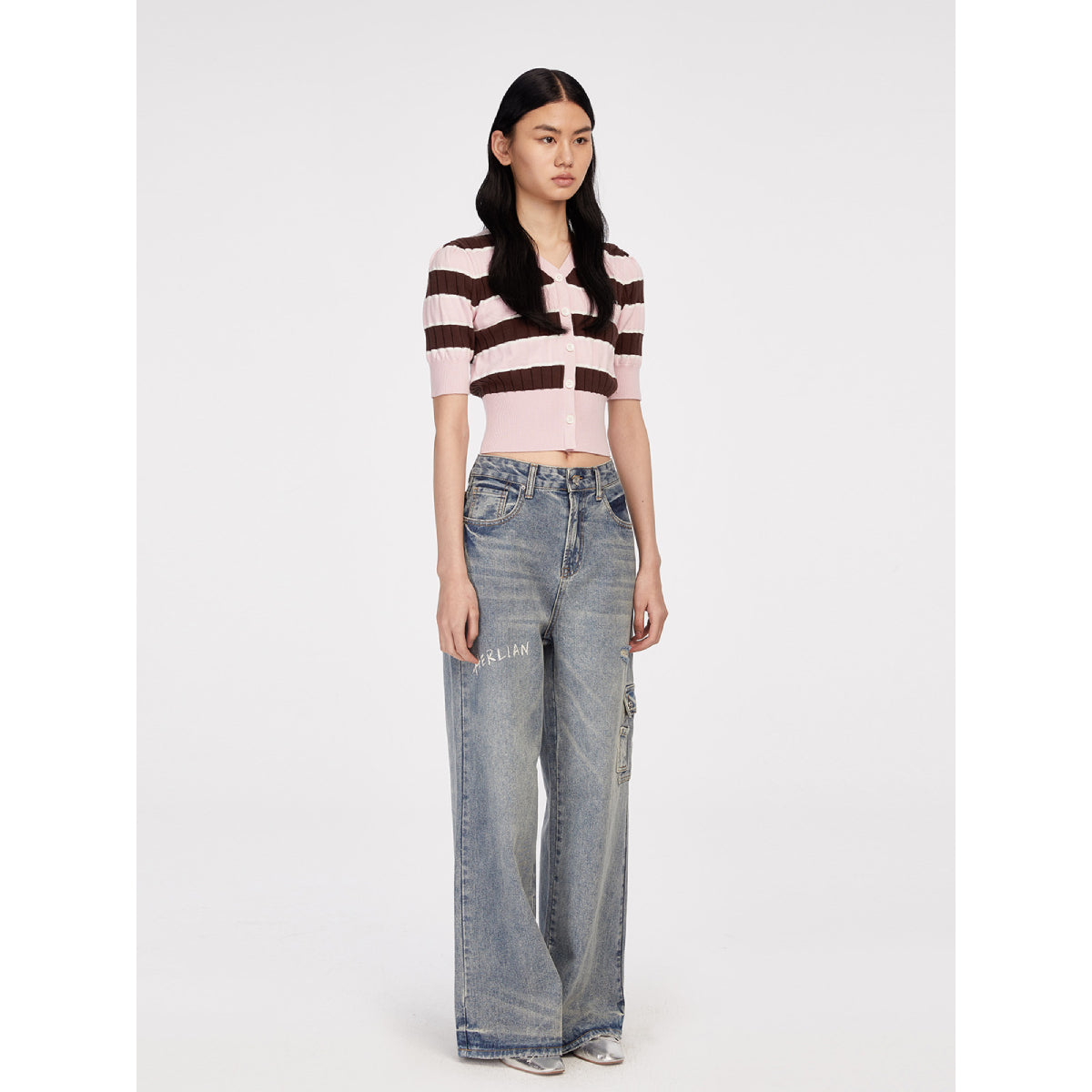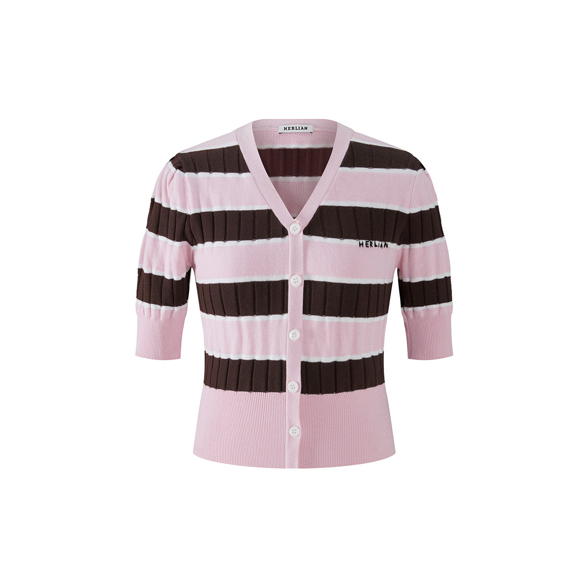Herlian Striped Contrast Short Sleeve Knit Top Pink
