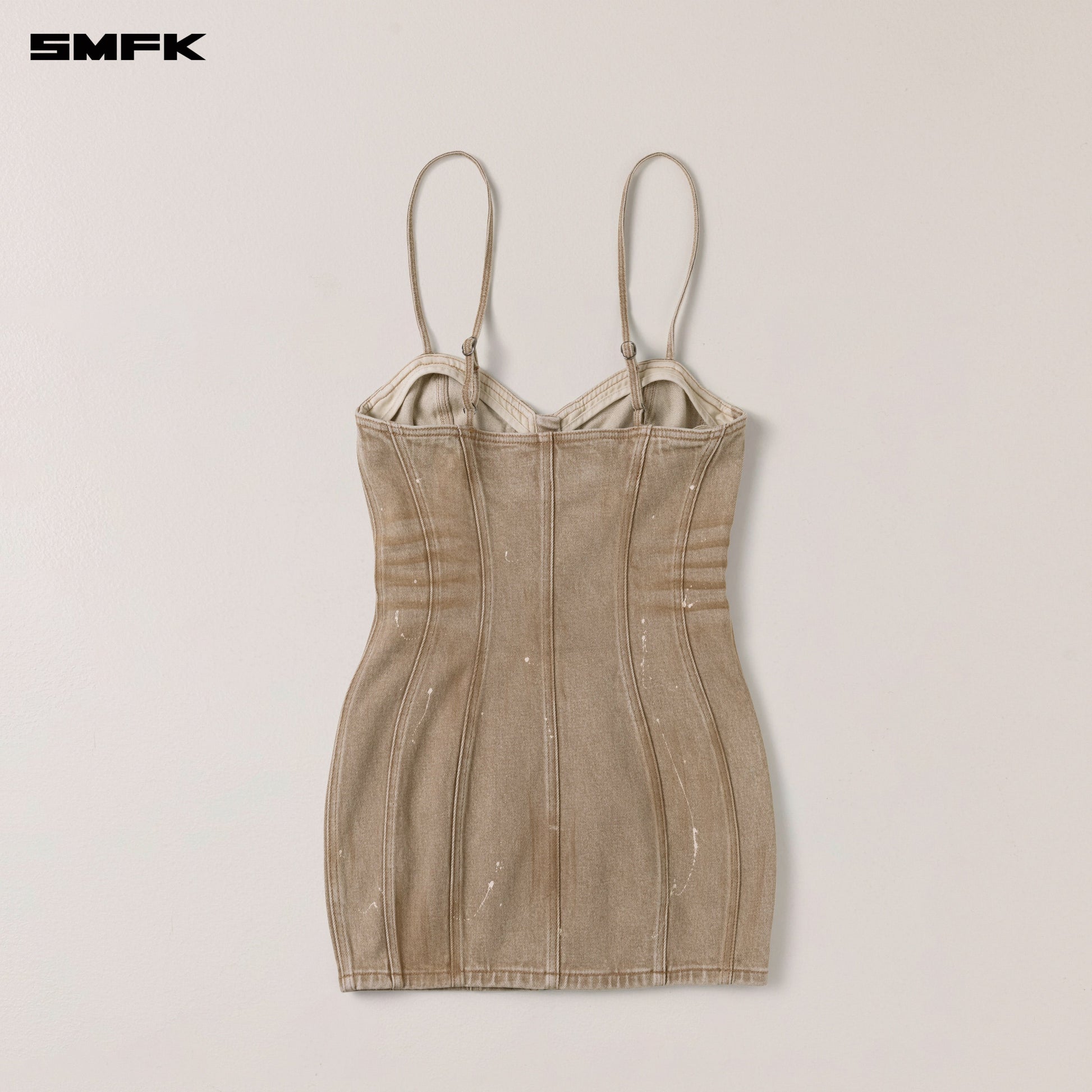 Design: SMFK RAGE Wild handcrafted collection showcases the classic silhouettes and fabric characteristics of denim and workwear, employing a variety of specialized denim and workwear construction techniques alongside layered artisanal craftsmansHips. This collection embodies SMFK’s untamed spirit and reverence for nature. The RAGE Wild handcrafted collection is a meticulously crafted non-standardized product line by SMFK. Within the stability of fixed silhouette designs, it seeks the greatest extent of unpredictability, offering users an innovative visual and wearing experience—each piece is truly unique. The SMFK ICON Classic Denim Dress, initially designed in 2020, combines a corset-inspired bodice with a full-length dress silhouette. Crafted from stretch denim, the design features a multi-panel construction for a sculpted fit, finished with double-needle topstitching.