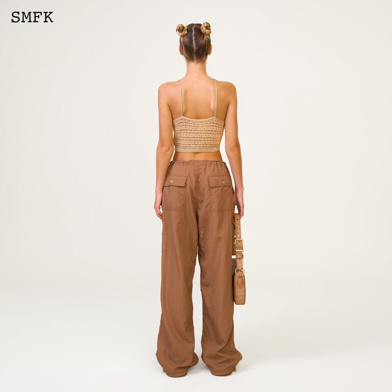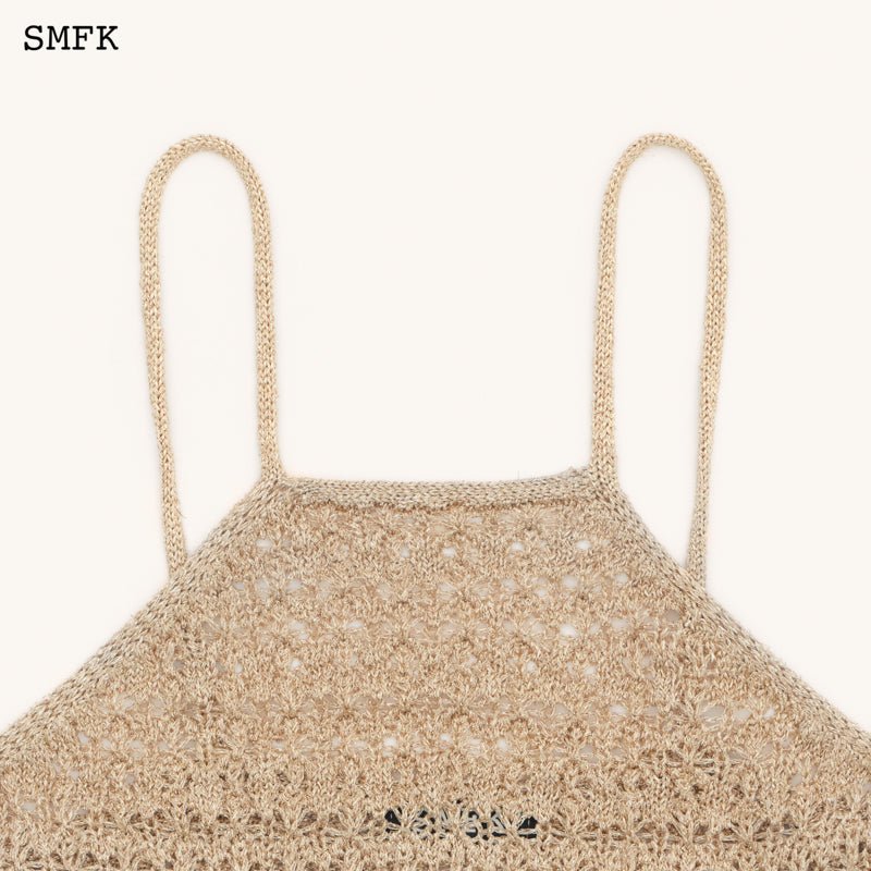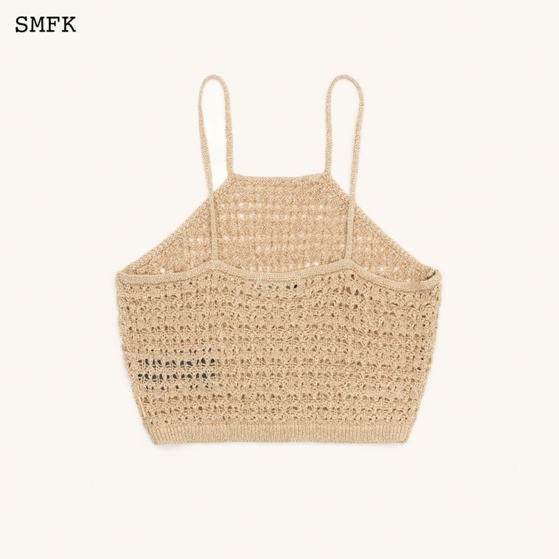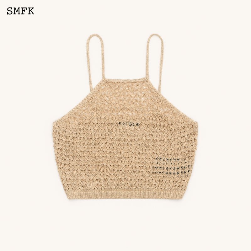 - Design: A new Chinese-style flat-mouthed knit camisole designed by SMFK in 2024. Inspiration is drawn from the flat-mouthed bellyband design style in Chinese classical clothing. The summer version of 2024 uses golden sand cotton-linen blended special yarn blended knit to present a fine sand-textured glittering effect.
